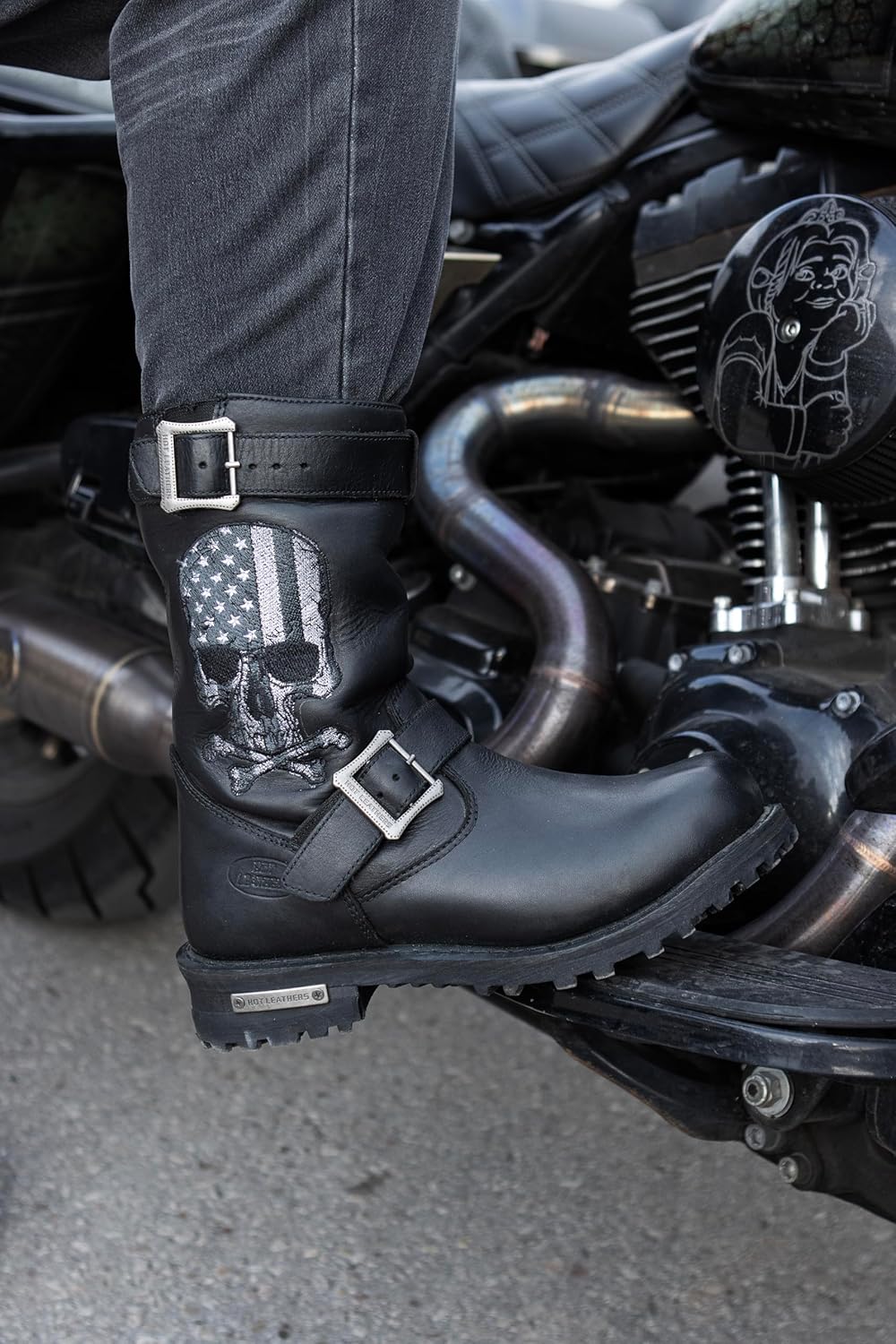 Hot Leathers BTM1018 Men’s Black Tall Harness Flag Skull Boot with Round Toe Features Top Grain Leather Water Resistant Slip Resistant Oil Resistant Sole Antiqued Silver YKK Zippers Smart-Mask Performance Insole Non-Marking, Heat Resistant Lug Sole Double Stitched Padded Upper Hot Leathers All New Men’s 10” Round Toe Engineer Boot. Hot Leathers is proud to present our new Riding Collection of motorcycle boots for men and women. This great new design features our Flag Skull image which is embroidered directly onto the leather. It has a full inside zipper for easy on and off as well as a heavy-duty lug sole. Hot Leathers Riding Collection is a growing line of the absolute highest quality leather boots made specifically for motorcycling. Each of these motorcycle boots are handcrafted by highly skilled craftsmen and women who know what it takes to make long lasting quality footwear. All of these riding boots are water and slip resistant and use heavy duty hardware and YKK zippers.