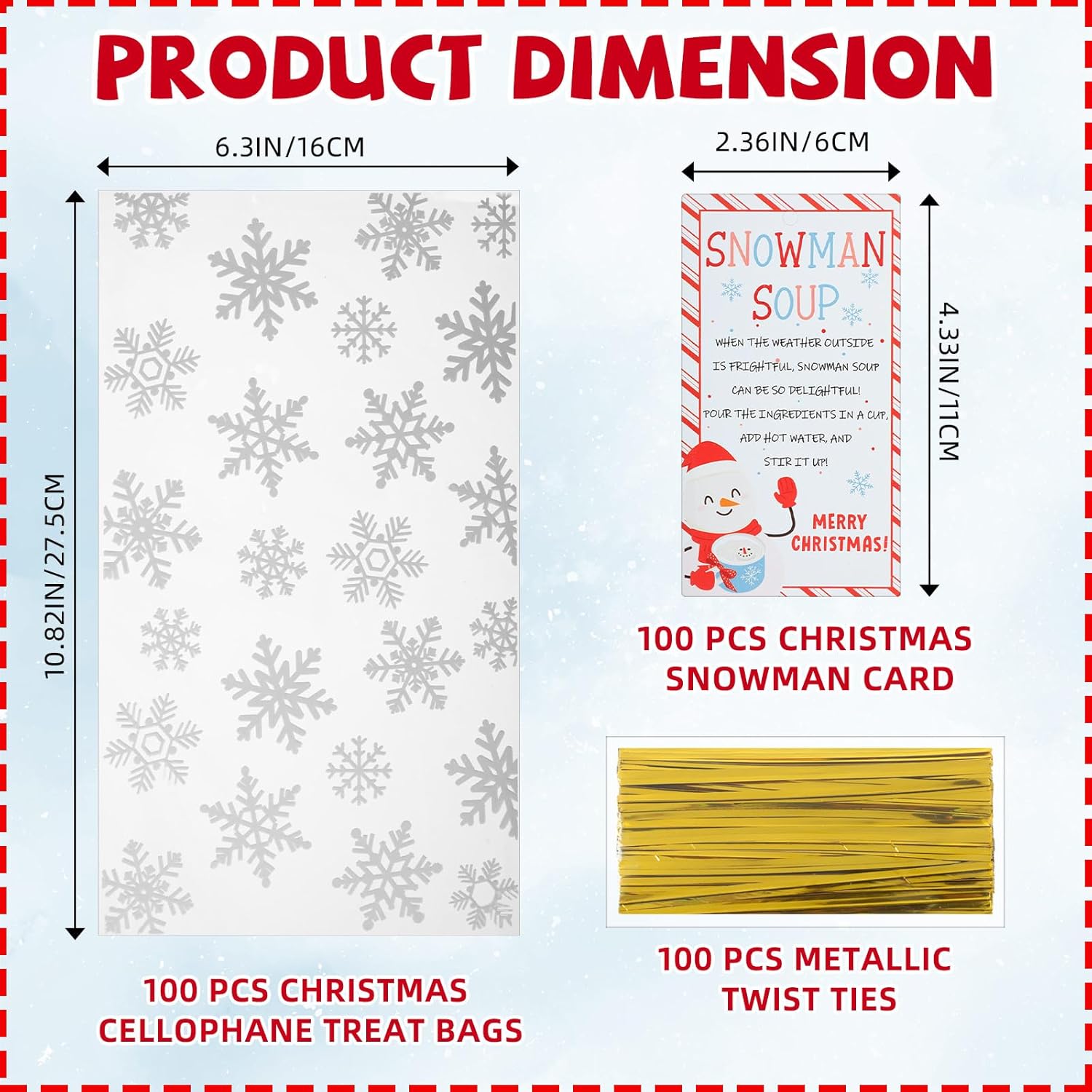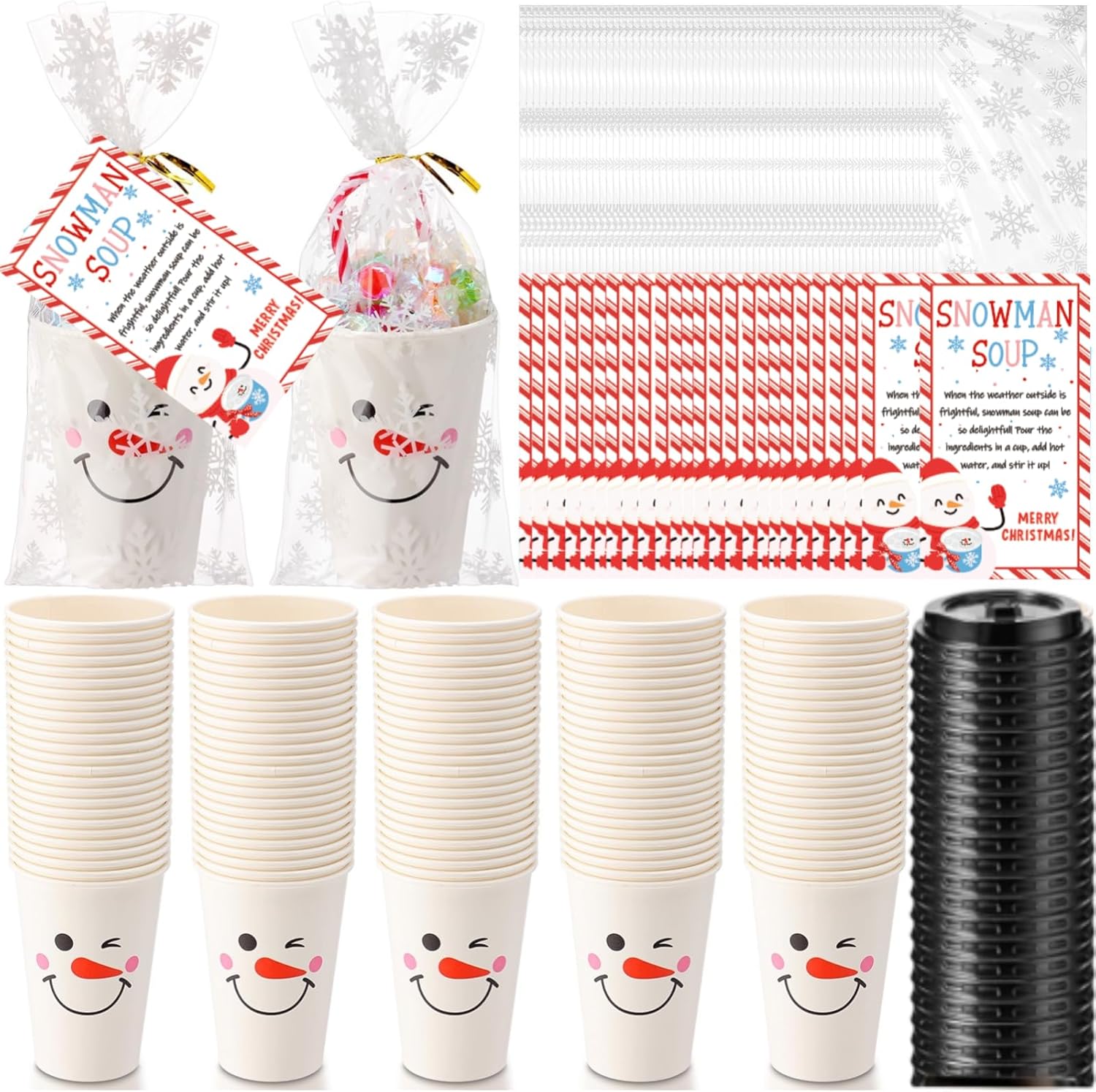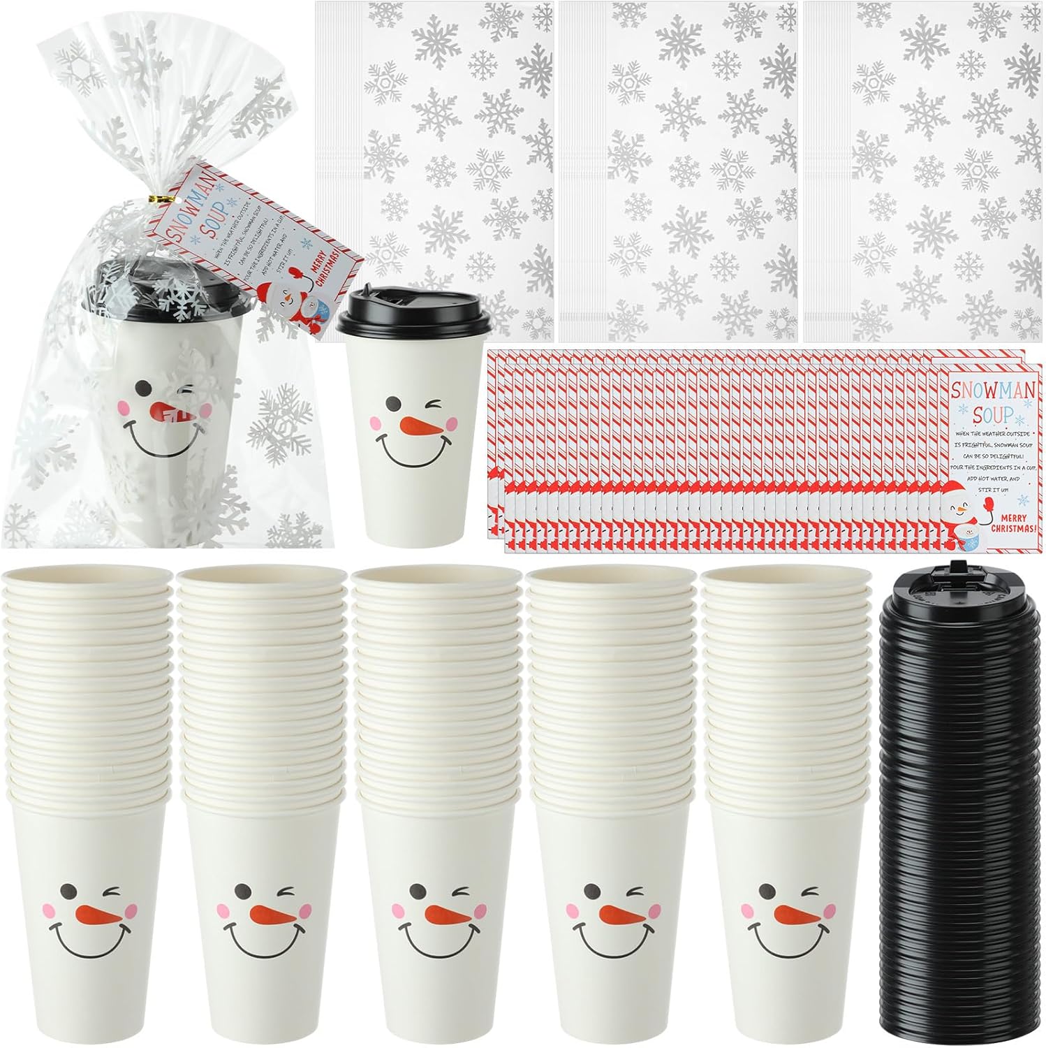 | Included Components | 100 x Snowflake Cellophane Gift Bags, 100 x Snowman Paper Cups with Lids, 100 x Snowman Soup Tags, 100 x Twist Ties |