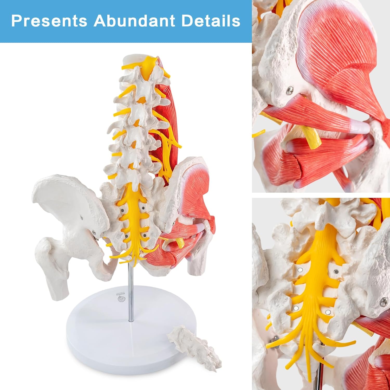 Enhance hip and pelvic anatomy learning with this life-size male pelvis model featuring the femoral head, detailed musculature, and visible nerve branches. The model is sculpted to emphasize anatomical relationships between the pelvic ring, acetabulum, proximal femur, major hip muscles, and adjacent nerve pathways - making complex three-dimensional anatomy intuitive and easy to demonstrate. Its life-size scale and distinct color differentiation allow rapid identification of muscle groups, bony landmarks, and nerve courses during classroom demonstrations, lab exercises, or one-on-one patient consultations. Mounted on a stable base for secure display, this model is built for repeated handling in teaching environments and clinical settings. Whether used in anatomy classes, physical therapy education, orthopedic review, or patient education, this pelvis model is a reliable visual aid that improves comprehension of hip mechanics, nerve relationships, and pelvic anatomy.