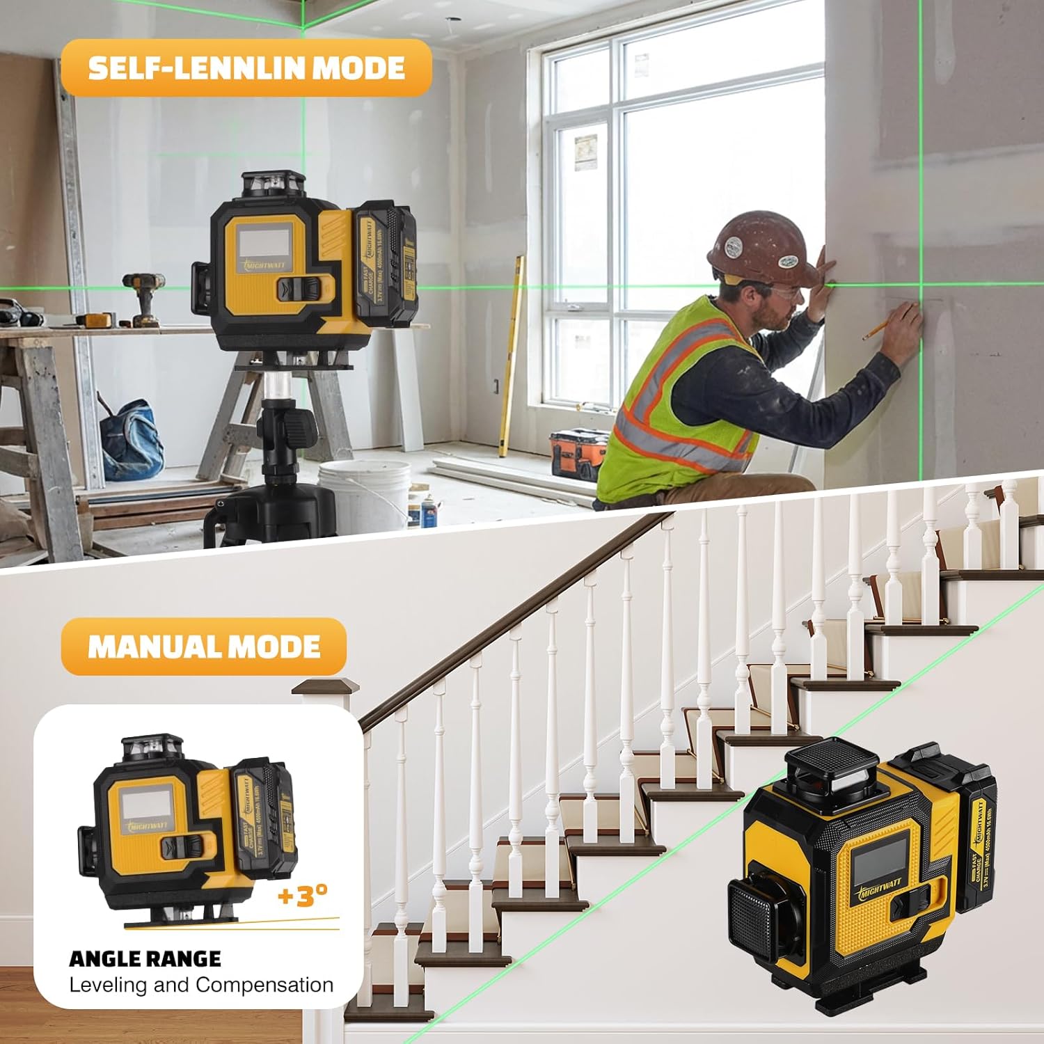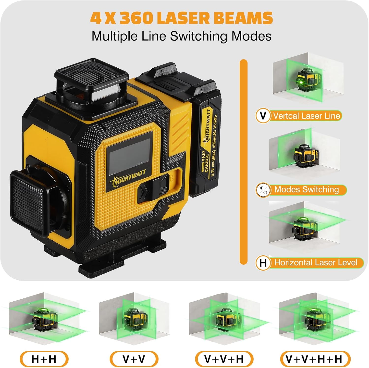 Unlock Professional Precision with Our 4D 16-Line Green Laser Level SystemTackle any leveling and layout project with confidence and unmatched efficiency. Our advanced 4D 16-Line Self-Leveling Green Laser Level is engineered for professionals and dedicated DIY enthusiasts who demand accuracy, visibility, and convenience.Complete All-in-One Professional Package:Forget buying accessories separately. This comprehensive kit is equipped with everything to get you started immediately: 1 x 16-Line Green Laser Level 1 x 1m Professional Aluminum Tripod 1 x Magnetic L-Bracket (for metal surfaces) 1 x Wall Mount Bracket 1 x 360° Rotating Lifting Platform & Base 1 x Remote Control 2 x Rechargeable Batteries & 1 x US Charger 1 x Laser Target Plate (Enhance Visibility) 1 x Laser Enhancement Glasses 1 x User Manual (English)Powerful 4D 360° Laser Technology:Generate a full-room grid of crosslines with four perfectly aligned planes. Project one 360° horizontal line and three 360° vertical lines simultaneously to create precise right angles and level benchmarks on every surface around you. This is ideal for complex tasks such as installing cabinetry, laying out electrical systems, building partitions, and hanging pictures with perfect alignment.Unbeatable Green Laser Visibility:The 532nm wavelength green laser diode is significantly brighter to the human eye than red lasers. This means clearer lines in various lighting conditions, reducing eye strain and increasing productivity. The beams remain visible at extended distances, up to 20m (66ft) indoors, and even farther when used with the included laser detection glasses and target plate.Intelligent Features for Smart Operation: Self-Leveling & Alarm: The tool automatically levels itself within ±3°. An audible alarm will sound if the unit is tilted beyond this range, alerting you to inaccurate readings. Manual Mode: Lock the pendulum to project laser lines at any desired angle for tasks like laying diagonal tiles or creating ramps. Remote Control: Operate the laser functions wirelessly from up to 10m away, saving you time and effort from constantly walking back to the unit.Robust and Built to Last:Constructed from durable aluminum alloy with an IP54 rating, this laser level is built to withstand the rigors of daily use on construction sites. It is protected against dust and water splashes, ensuring long-term reliability. The secure carrying case keeps all components organized and protected during transport and storage.Ideal For:Contractors, carpenters, electricians, plumbers, tilers, and home renovation enthusiasts. Perfect for a wide range of applications including: Floor & Ceiling Installation Wall Framing & Partition Construction Tile Laying & Kitchen Fitting Picture & Shelf Hanging HVAC and Electrical System InstallationOrder now and equip yourself with the ultimate precision tool that transforms the way you work!