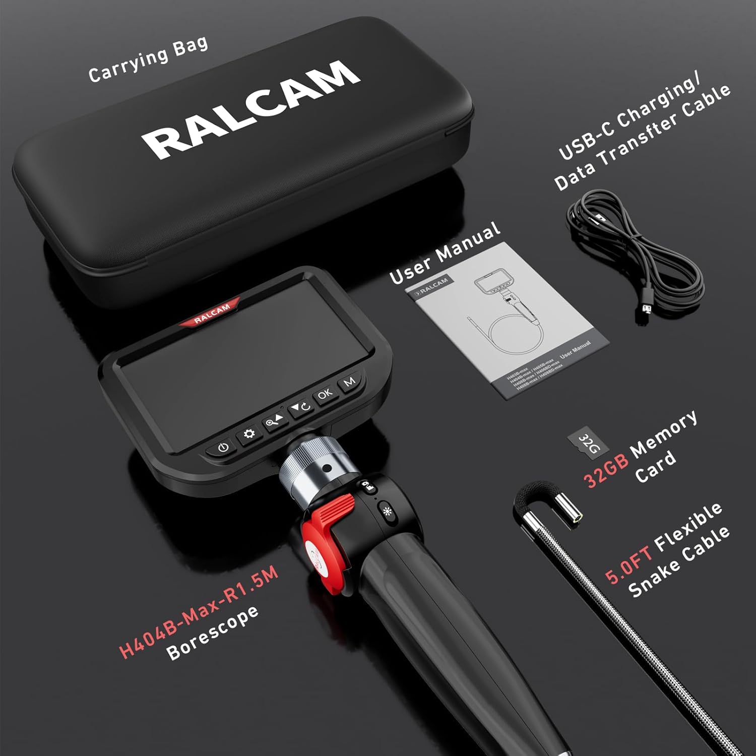 | BuiltIn Media | 1 × 3.9mm Camera Probe (5.0FT Stainless Steel Snake Tube), 1 × 32GB TF Card (Included), 1 × Protective Carrying Case, 1 × Ralcam Borescope (5” Display), 1 × USB-C Charging Cable |