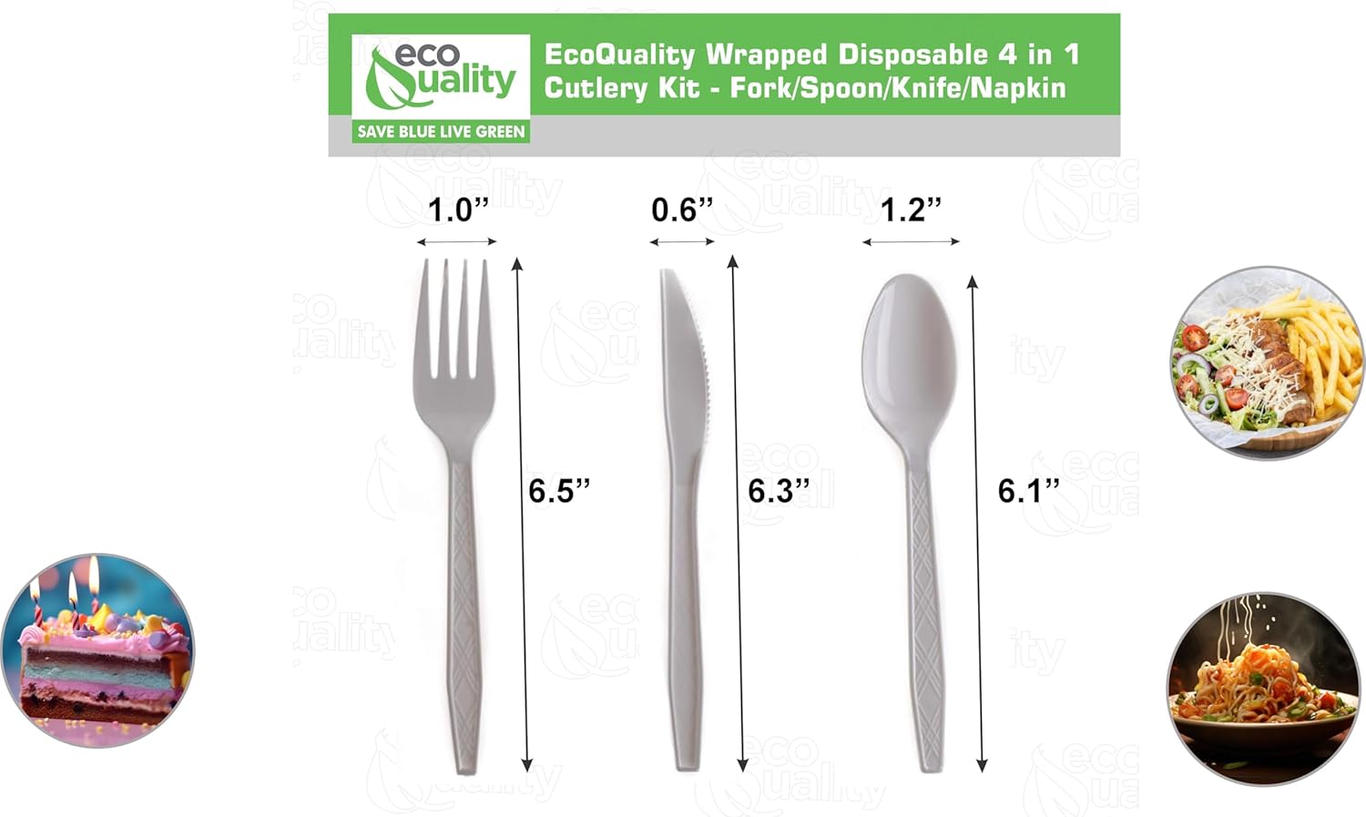 4 in 1 Meal Kit Heavy Duty Cutlery Pack by EcoQuality? Cutlery Pack Includes Heavy Duty Fork, Spoon, Knife, and Napkin ? Each Cutlery Pack comes Individually Wrapped ? Great for Lunch, Office Parties, On the Go, Meal Prep. ? Used by Restaurants, Catering Services for easy to-go orders as well as Sanitation ? Comes in a 250 count packaging with Each Cutlery Pack Individually Wrapped ? Contains a Disposable Fork, Disposable Spoon, Disposable Knife, and Napkin Great for easy and clean Sanitation ? Never have to carry around your dirty Cutlery with our Disposable Cutlery Pack ? Heavy Duty means that you will enjoy using our cutlery as much as the one at home! ? The pre-assembled and wrapped kit helps facilitate distribution for Cafeterias, Restaurants and Large Gatherings Comes straight to your door in a 250 Count Packaging!Add to Cart Today!We Encourage everyone to Reuse and Recycle!