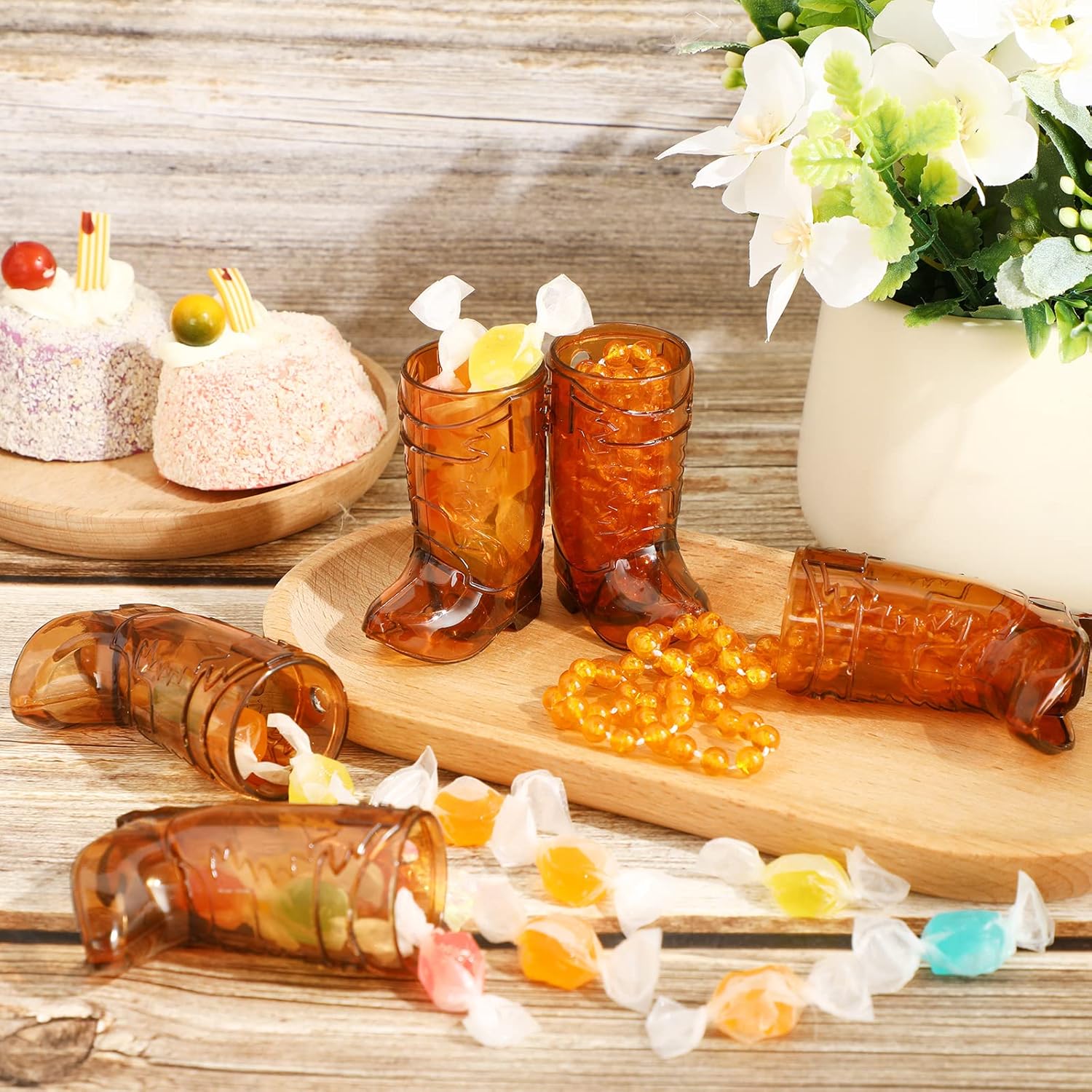 Features: Easy to match: Considering the simple and stylish designs, bright and vibrant colors, the plastic shot cups necklaces are easy for you to match well with various styles of romantic occasions. Also they can keep harmonious with house styles, which can bring refreshing feelings. Funny gift choices: With exquisite craftsmanship and attractive appearance, the disposable shot glasses necklaces are considered as ideal presents for your friends, family members, neighbors, colleagues, etc., which will gain their affections. Specifications: Material: plastic Color: transparent brown Size: as pictures show Package includes: 36 x Cowgirl boot shot glass necklaces Notes: Manual measurement, please allow slight errors on size. The color may exist a slight difference due to different screen displays. Winding risk, please keep away from children.