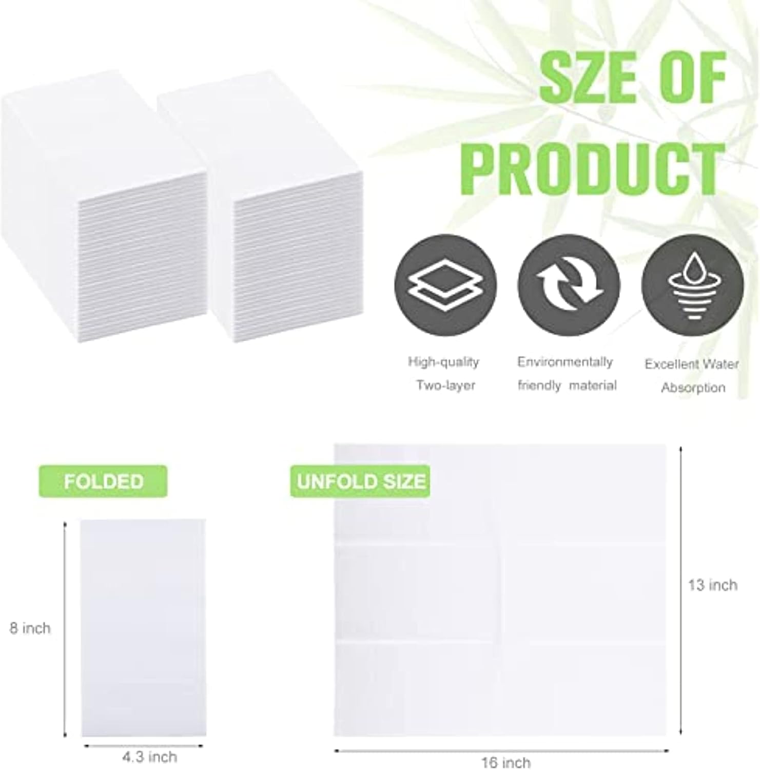 Features: Made from wood pulp, our disposable napkins are strong and won't break easily. Durable napkins can be applied throughout the meal time, clean white, using only natural materials, safe and without synthetics, so that you can use with peace of mind Disposable tissues are suitable for bathrooms, family gatherings, birthday parties, restaurants, weddings, anniversaries, cocktail parties, guest rooms, etc., or any event you want. It's even a good option as a portable tissue to take with you, one-time use, no cleanup required. Specifications: Material: paper Color: white Size: 13.0 x 15.7 inch/ 33 cm x 40 cm unfolded, 4.3 x 7.9 inch / 11 cm x 20 cm when folded Package includes: 600 x White disposable napkins Notes: Manual measurement, please allow slight errors in size. The color may exist a slight difference due to different screen displays.