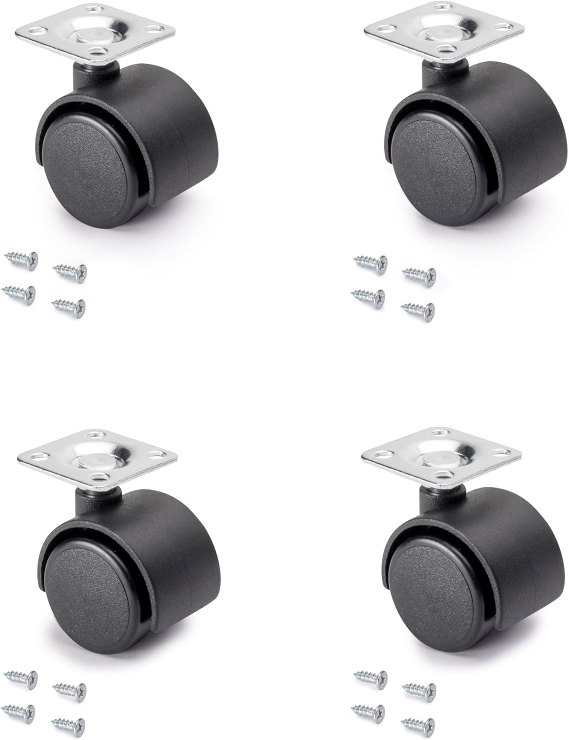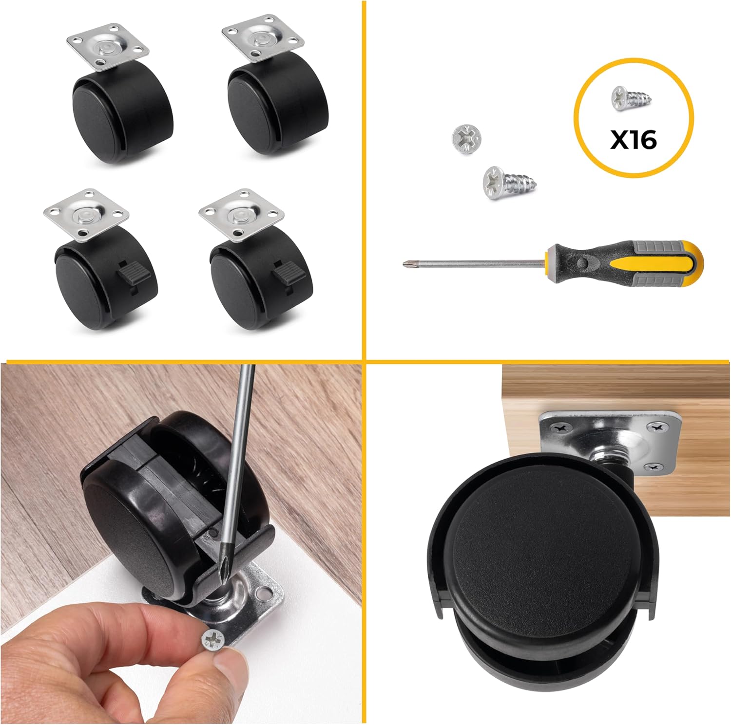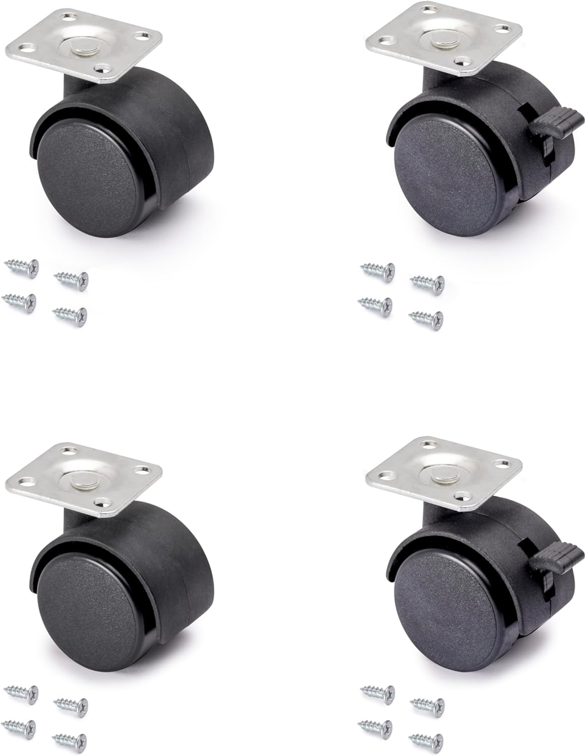 This set includes 2 swivel caster with fixing plate and brake, 2 swivel caster with fixing plate without brake and the screws needed for the assembly.Easy to mount, these wheels optimize and improve your furniture thanks to their ball bearings, which provide a smooth and silent glide.