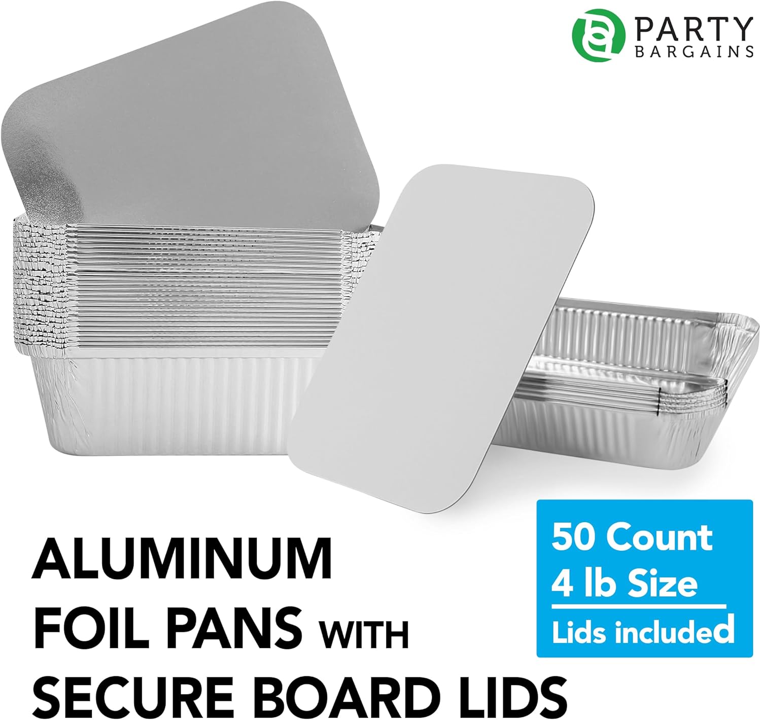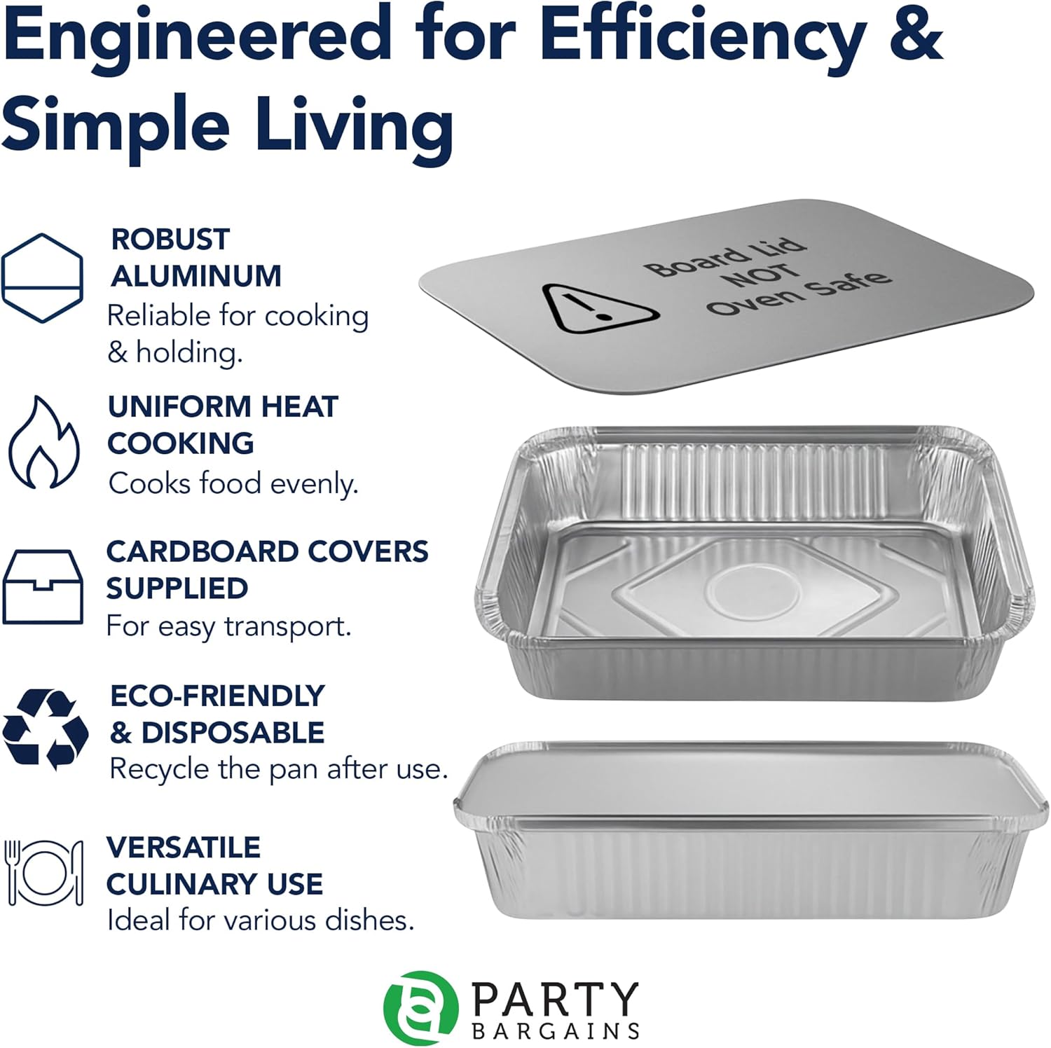 Serve, store, and transport food with confidence using PARTY BARGAINS 4 lb Aluminum Pans with Board Lids. Designed for both home kitchens and professional food service, these disposable foil pans deliver dependable performance for cooking, catering, and meal prep. Each pan is crafted from high-quality aluminum that promotes even heat distribution, making it ideal for baking, roasting, steaming, and reheating a wide variety of dishes. From casseroles and pasta to meats, vegetables, and desserts, these pans help ensure consistent results every time. The aluminum pan is oven safe up to 240°C (464°F), providing flexibility for hot food preparation. Important: Board lids are intended for storage and transport only and should not be placed in the oven. The included board lids fit securely to help retain warmth, reduce mess, and protect food during delivery or storage. Lightweight yet sturdy, these pans are easy to stack, transport, and dispose of after use—saving time on cleanup without sacrificing presentation. With a practical 12 x 8 x 1.7-inch size and 4 lb capacity, these aluminum pans are an economical and reliable choice for caterers, restaurants, food trucks, parties, holidays, and everyday meal prep. Trust PARTY BARGAINS for convenient, dependable disposable food service solutions.