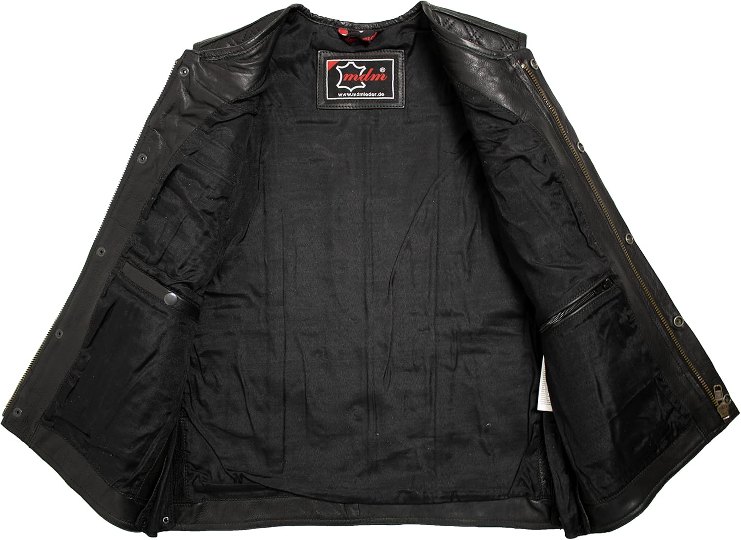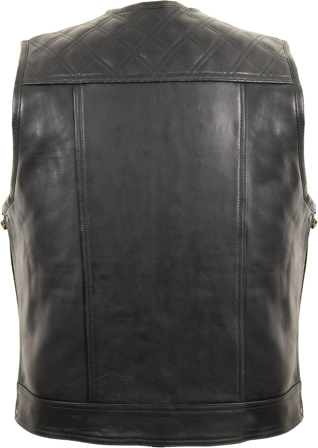 Crafted from genuine cowhide leather with a sleek black base color, this piece boasts a thickness ranging from 1.1 to 1.2 mm. The leather is not only thick for durability but also remarkably soft, providing a luxurious and comfortable feel. This combination of strength and suppleness makes it an ideal choice for those seeking a high-quality leather product that offers both resilience and a touch of luxury.This leather vest is equipped with a practical and stylish array of pockets. On the exterior, you'll find two outer pockets secured with press studs, providing easy access and secure closure. Additionally, the vest features two breast pockets with press studs, offering a balance between convenience and a classic look.Internally, the vest is designed with functionality in mind. It includes two inside pockets, one of which is secured with a zipper for added security. These pockets provide ample storage space for your belongings, making this leather vest not only a fashion statement but also a practical and versatile piece for your everyday needs.Enhancing its distinctive aesthetic, this leather vest features a quilted diamond pattern on the shoulders. This unique design element adds a touch of sophistication and individuality to the overall look, creating a stylish and eye-catching detail. The quilted pattern not only contributes to the vest's visual appeal but also provides a subtle texture that sets it apart, making it a standout piece for those who appreciate both classic and contemporary styles.For added versatility, this leather vest is designed with practicality in mind. The sides of the vest can be extended using a zipper, allowing for an additional 5 cm on each side. This thoughtful feature enables you to comfortably wear the vest over a jacket, adapting to various layering preferences and weather conditions.