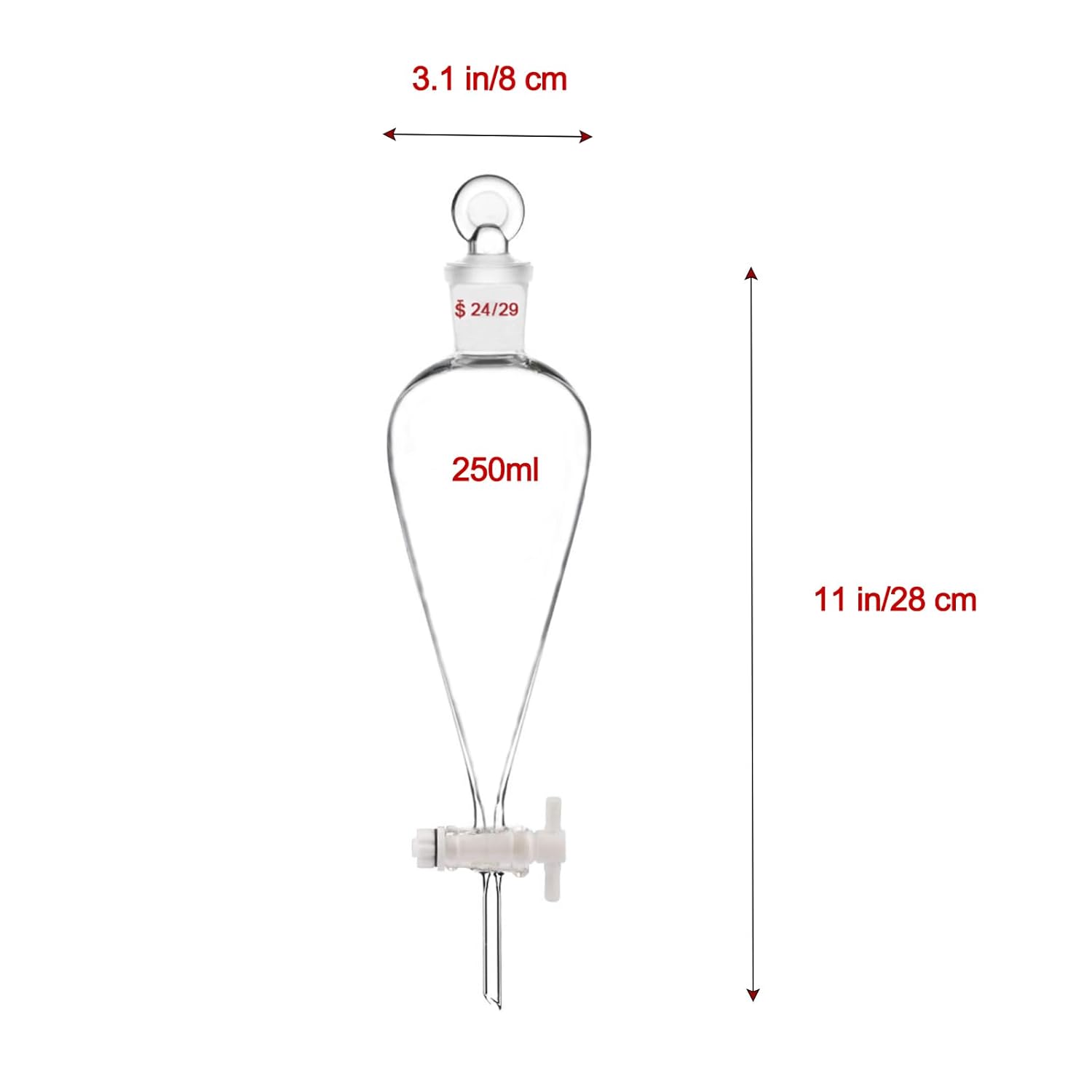 This Lab Borosilicate Glass 250ML Separating Funnel Heavy Wall Conical Separatory Funnel with 24/40 Joints and PTFE Stopcock is a high quality lab instrument that is designed for separating liquids from solids. It is made from heavy wall borosilicate glass, which is resistant to high temperatures and chemicals, and has a conical shape that allows for easy pouring and mixing. The funnel has a 24/40 joint and a PTFE stopcock, which makes it easy to connect to other laboratory equipment and to control the flow of liquids.