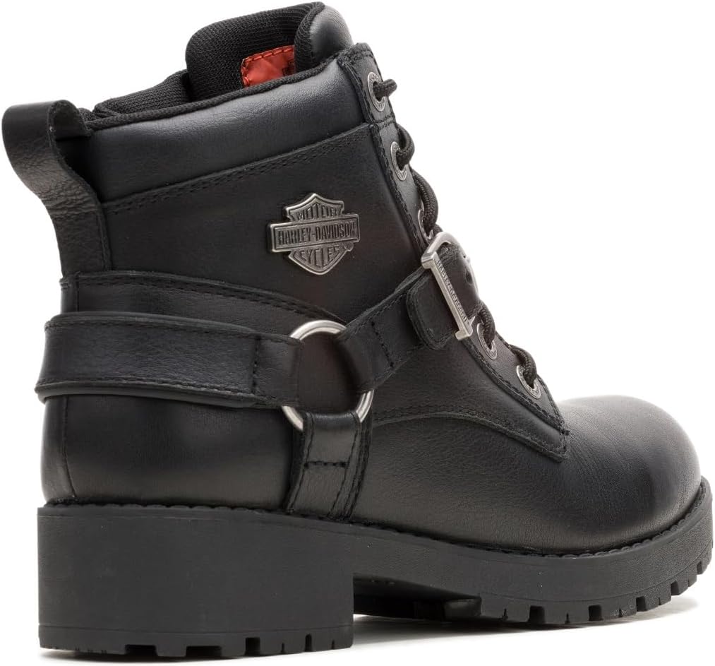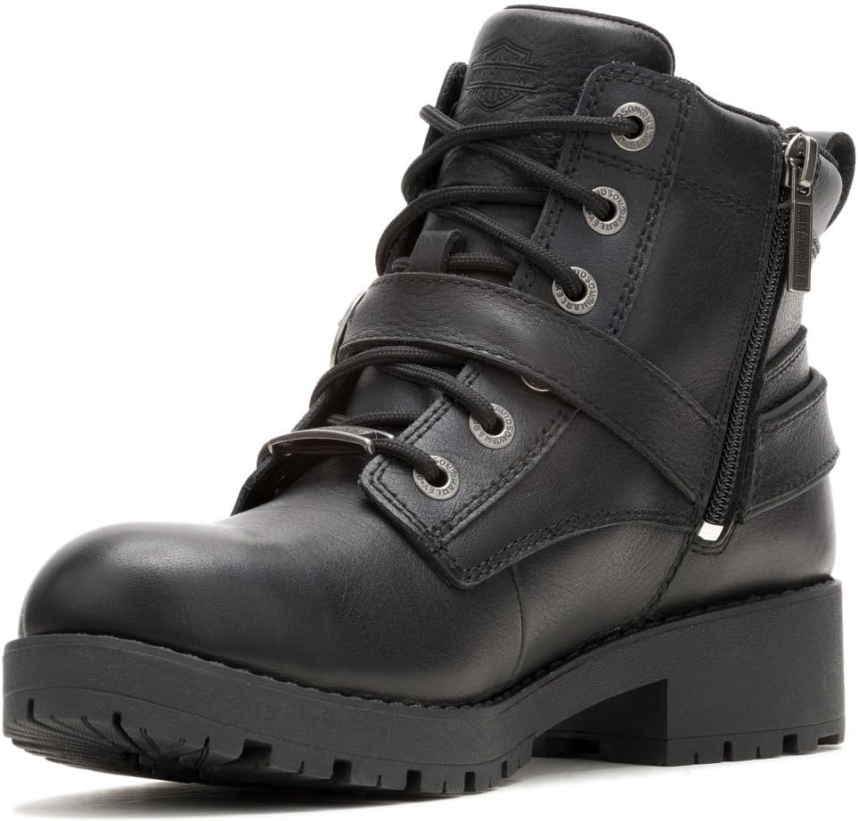 Harley-Davidson Women's Kelley Harness Ride, Riding Appropriate* 4.5-Inch Waterproof Black Motorcycle Boots, D87312. Unleash the road warrior within with the Kelley Harness Riding Boots. They are the ultimate fusion of rugged durability and sleek femininity for the modern biker. This means, that these boots are ready for more than just walking. Made with waterproof full-grain leather, they are lined with Hydro-Guard’s waterproof membrane, which means your feet breathe, and stay dry as well. And, it doesn’t stop there. The upper leathers are heat resistant, there is D30 ankle protection, and there is also 3M reflective materials – which means you’ll be seen under low light conditions. The toe is rounded. Classic harness styling shows up with the front cross-strap with logo buckle, which is attached to the harness O’Ring. A metal Harley-Davidson logo badge is threaded onto the bottom lace. Another metal logo is mounted on the shift. The tongue is padded for comfort. Donning is easy with the pull-on loop at the top of the backside shaft, not to mention the YKK locking inside zippers, making for a fast getaway. The boot's sole, insole and upper are bound using cement construction processes, a time honored and durable method that allows for a flexible and easy stride. For riding, wear with jeans. After the ride you can pair with skirts and dresses. Total height: 6", Shaft height: 4.5", Heel height: 1.5". Sizes US: M 5-10, 11. Manufacturer Part Number D87312. *Riding Appropriate – Abrasion, slip-resistant boots, ideal for riding motorcycles.