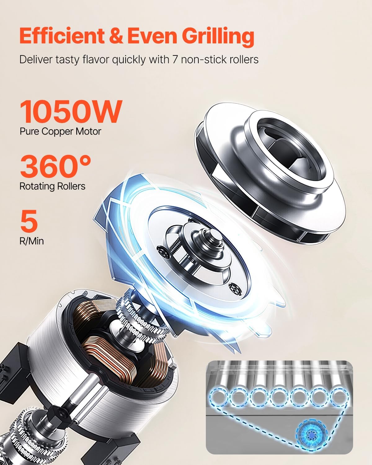 • Precise Temperature Control: Two knobs made it effortless to adjust the cooking temperature up to 482°F separately for front and back rollers. The left knob controls the front 3 rollers, and the right knob controls the back 4 rollers