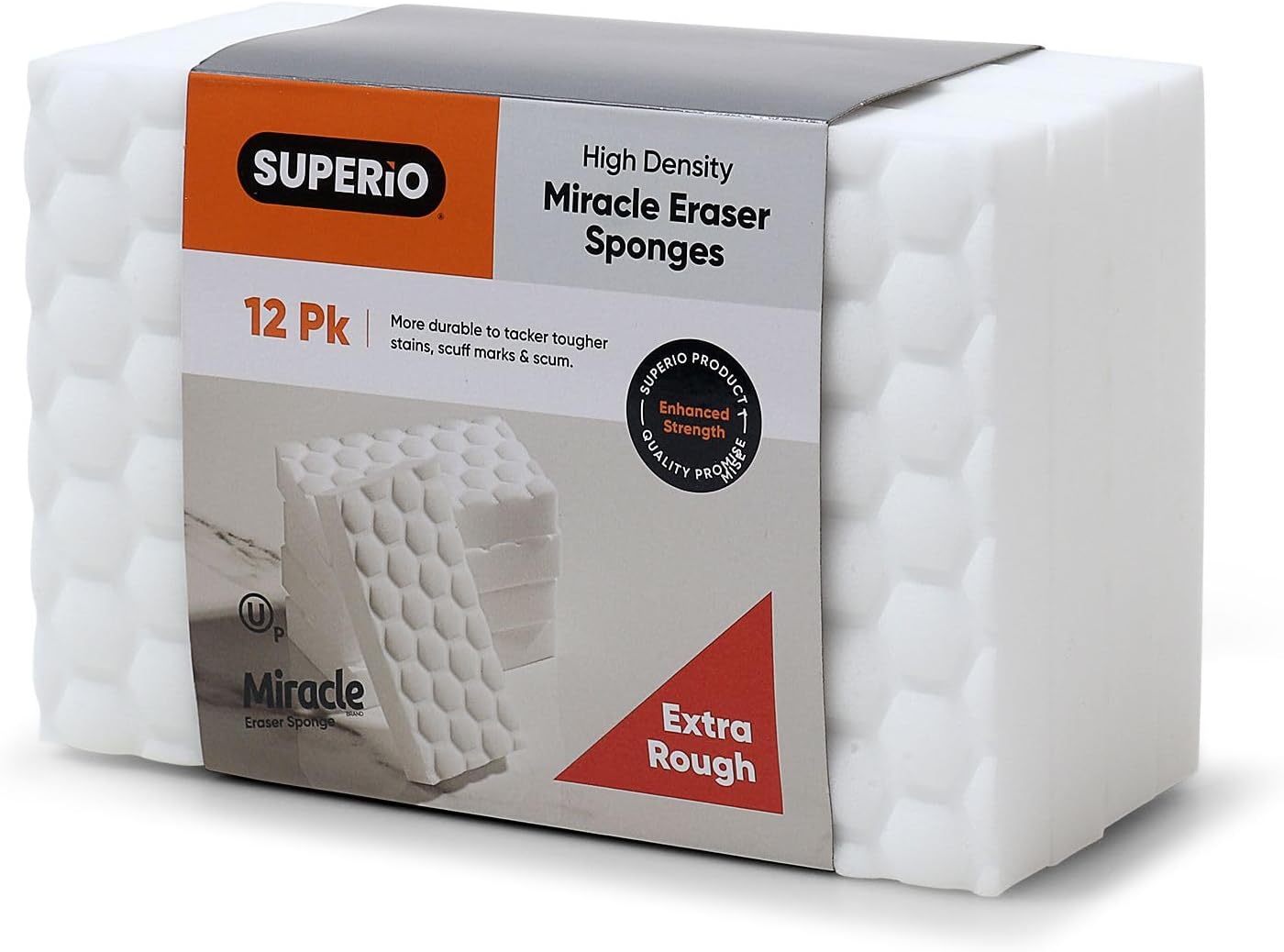 Durable and long-lasting, you can rely on the power and longevity of High Density Miracle Eraser Sponges. Engineered with a high-density construction and enhanced toughness to effectively remove heavy dirt and ingrained stains, and unique convex surface dots provide extra scrubbing power, making tough jobs easier than ever. Like the original Miracle Eraser, these sponges clean effectively with just water – no harsh detergents needed. Simply wet, squeeze, and wipe to tackle stubborn grime in your kitchen, bathroom, or any other area requiring heavy-duty cleaning. Despite their robust scrubbing power, these high-density sponges are designed to be scratch and streak-free on most surfaces. This value-sized 12-pack ensures you have plenty of these powerful cleaning tools on hand for all your toughest messes.