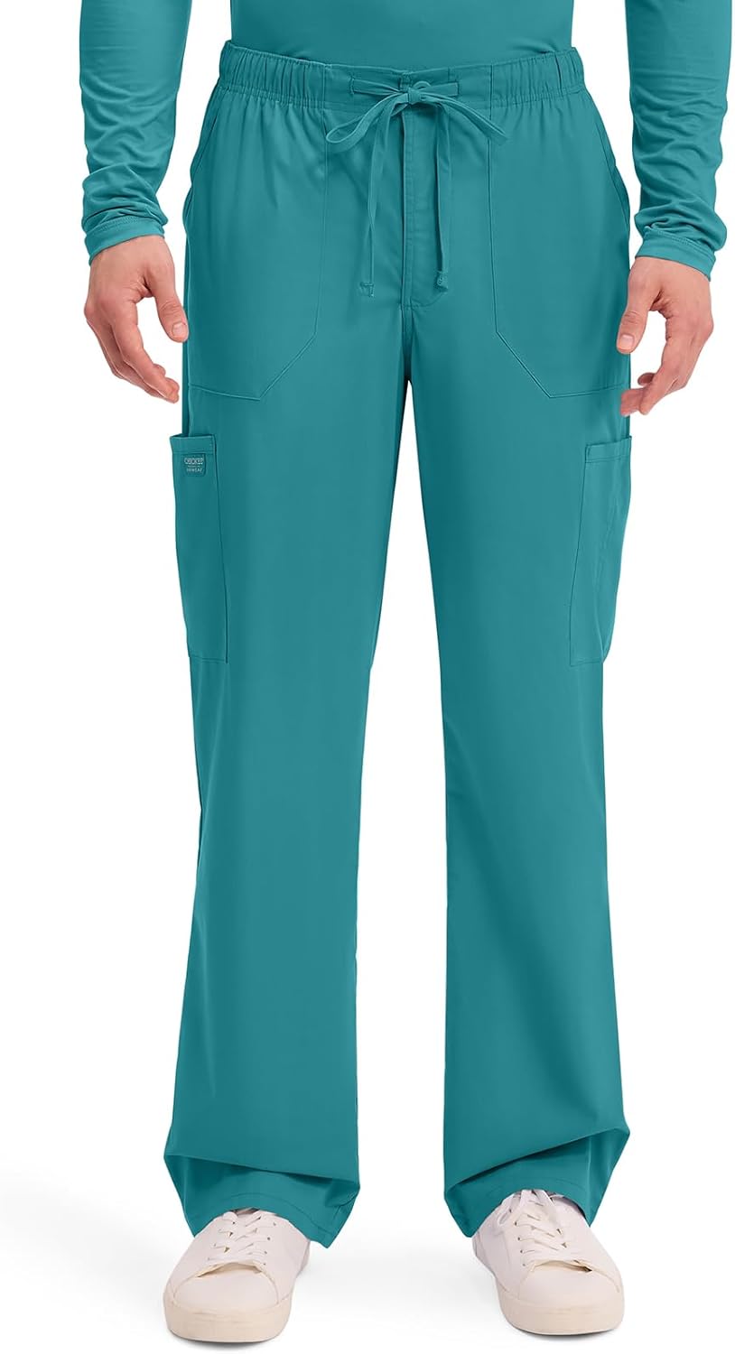 A Men's tapered leg pant with a functional inside drawstring and back elastic waistband features five belt loops and a zip fly with button closure. Also featured are front patch pockets, a logo label with bungee loop, right double cargo pocket with snap I.D. loop, back patch pockets and knee seams. Inseam:Â 32" Machine wash cold with similar colors. Do not bleach. Tumble dry low. Cool iron if needed.