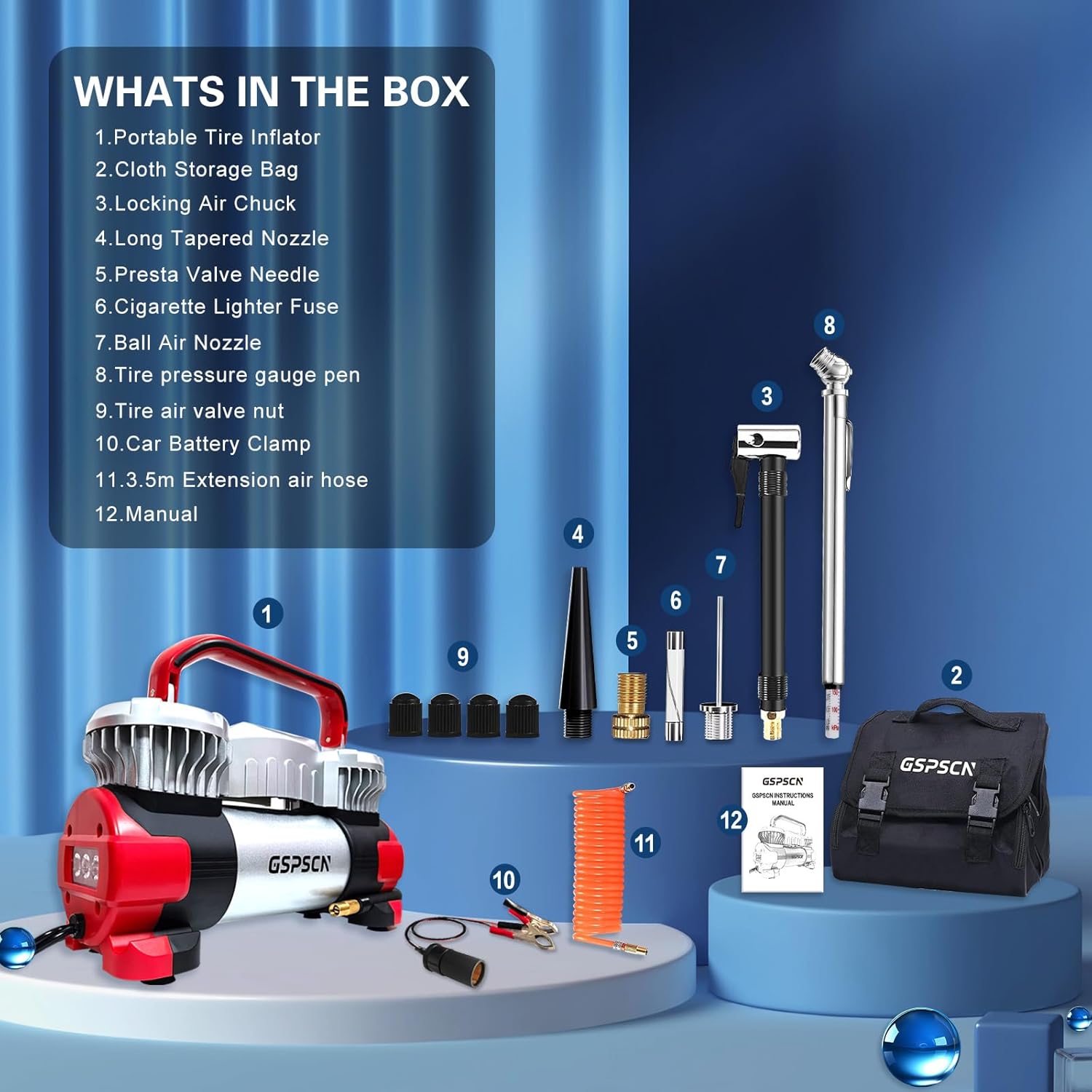 | Included Components | 1*Replacement Fuse, 3*Nozzle Adapters, 1*11.5FT Extend Air Hose, 1*Quick Connector, 1*Storage Bag, 1*User Manual, 1*Power Cord With Battery Clamps, 1* Pencil Tire Pressure Gauge, 4*Tire Air Valve Nut |