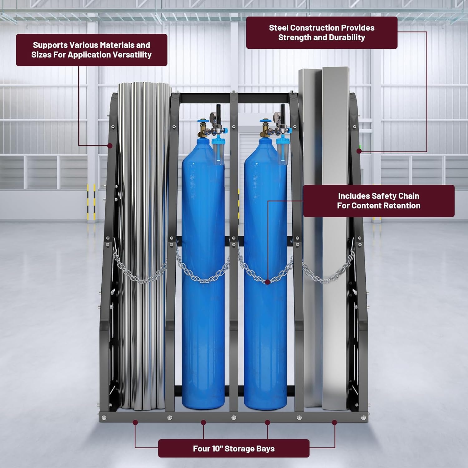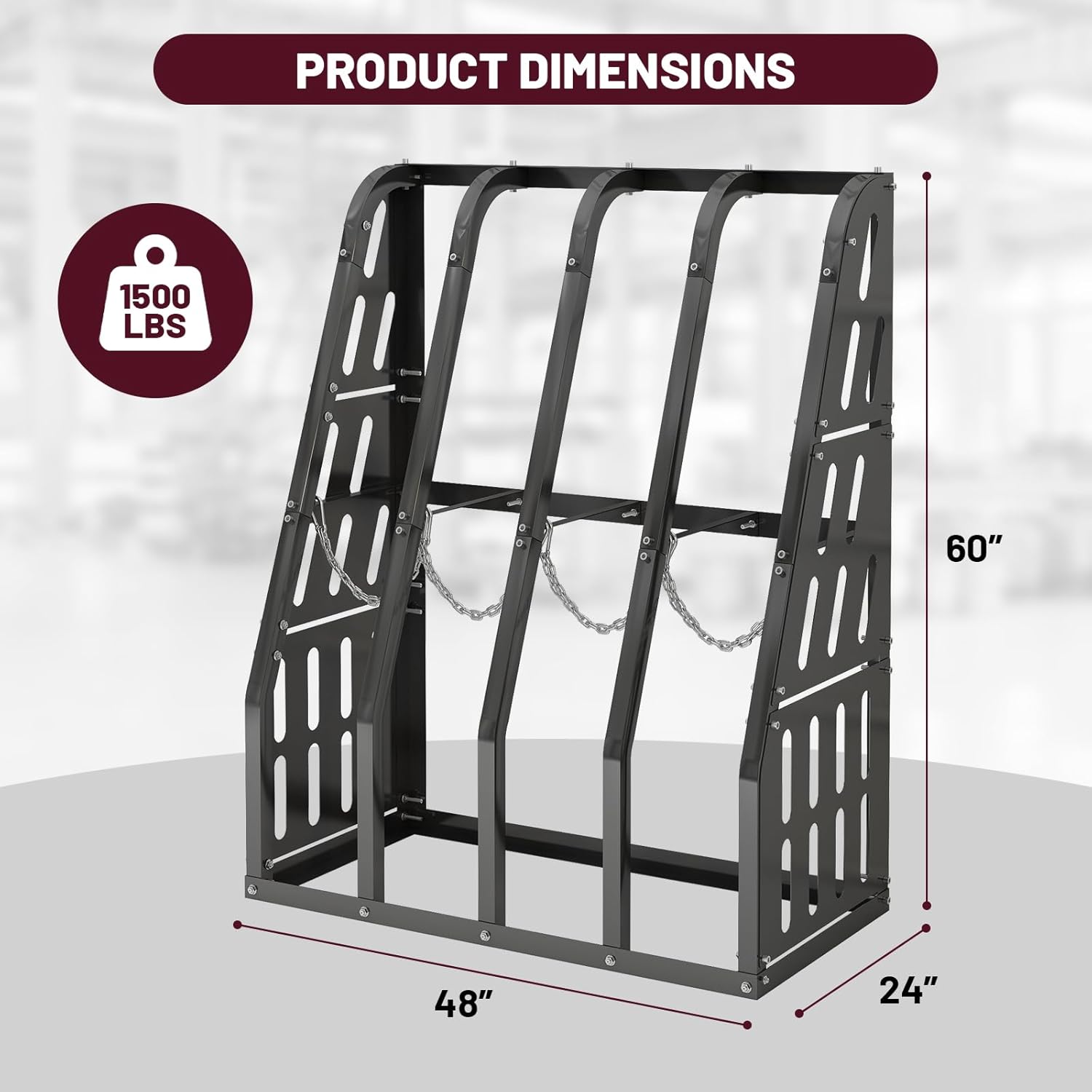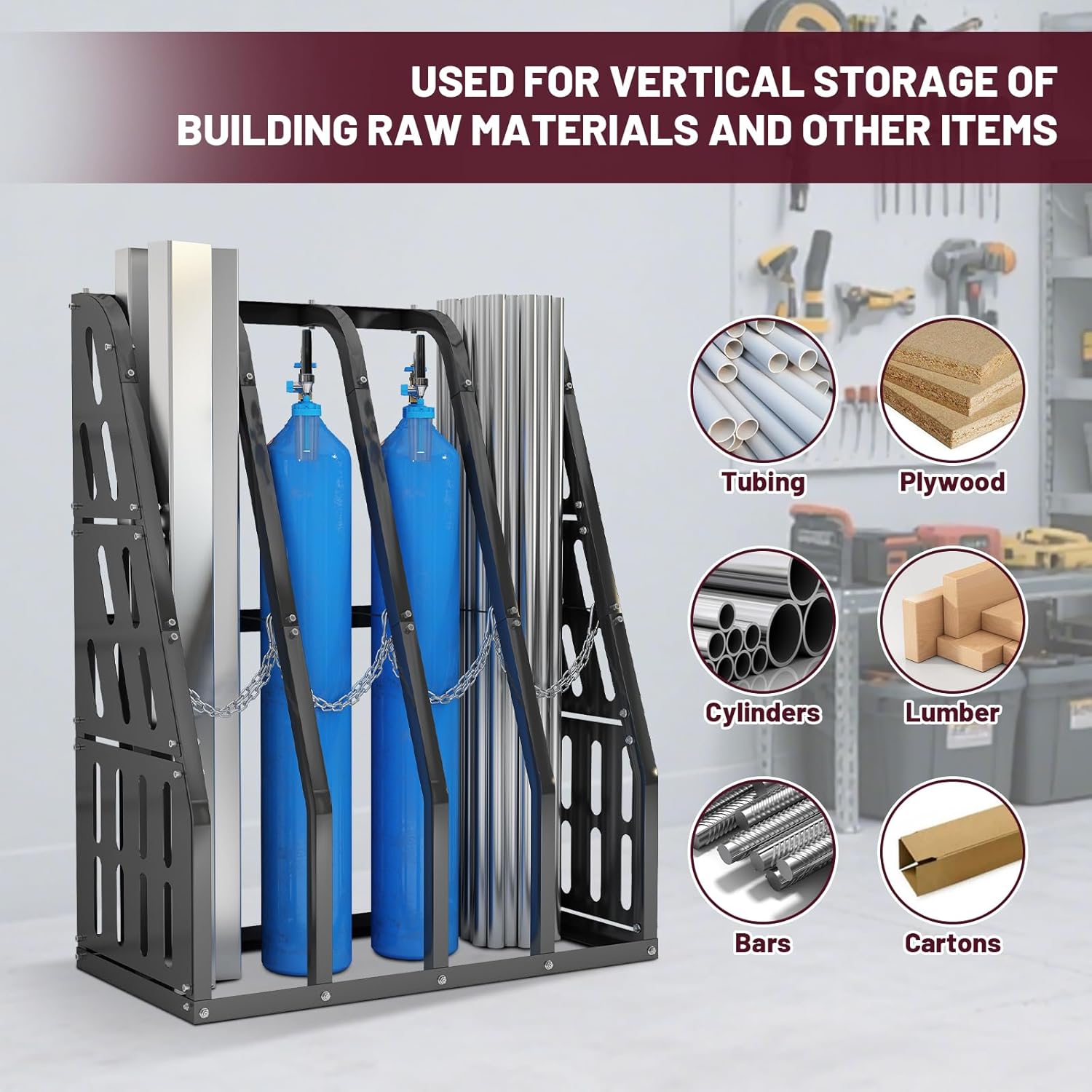 Built for long, bulky materials, this Vertical Long Parts Storage Rack pairs a heavy-duty angled steel frame with an all-welded, integrated tray rack to support up to 1,500 lb (evenly distributed) when installed against a wall. The space-saving 4-bay vertical layout keeps lumber, metal bars, pipes, and—where permitted—gas cylinders upright, visible, and easy to access, while four included safety chains secure loads and stabilize components. Rigid brackets resist bending, and the crossbars double as hang rails for tools and hoses to keep floors clear. Hollow side stripes accept hooks, baskets, and other accessories for customizable small-parts storage. A durable black/steel powder-coat finish resists wear and corrosion, making it ideal for garages, workshops, factories, sheds, and outdoor workspaces. Overall dimensions: 47" W × 24" D × 60" H. For maximum capacity and safety, anchor to a suitable wall, distribute weight evenly with the heaviest items on the bottom, and periodically inspect chains and fasteners.