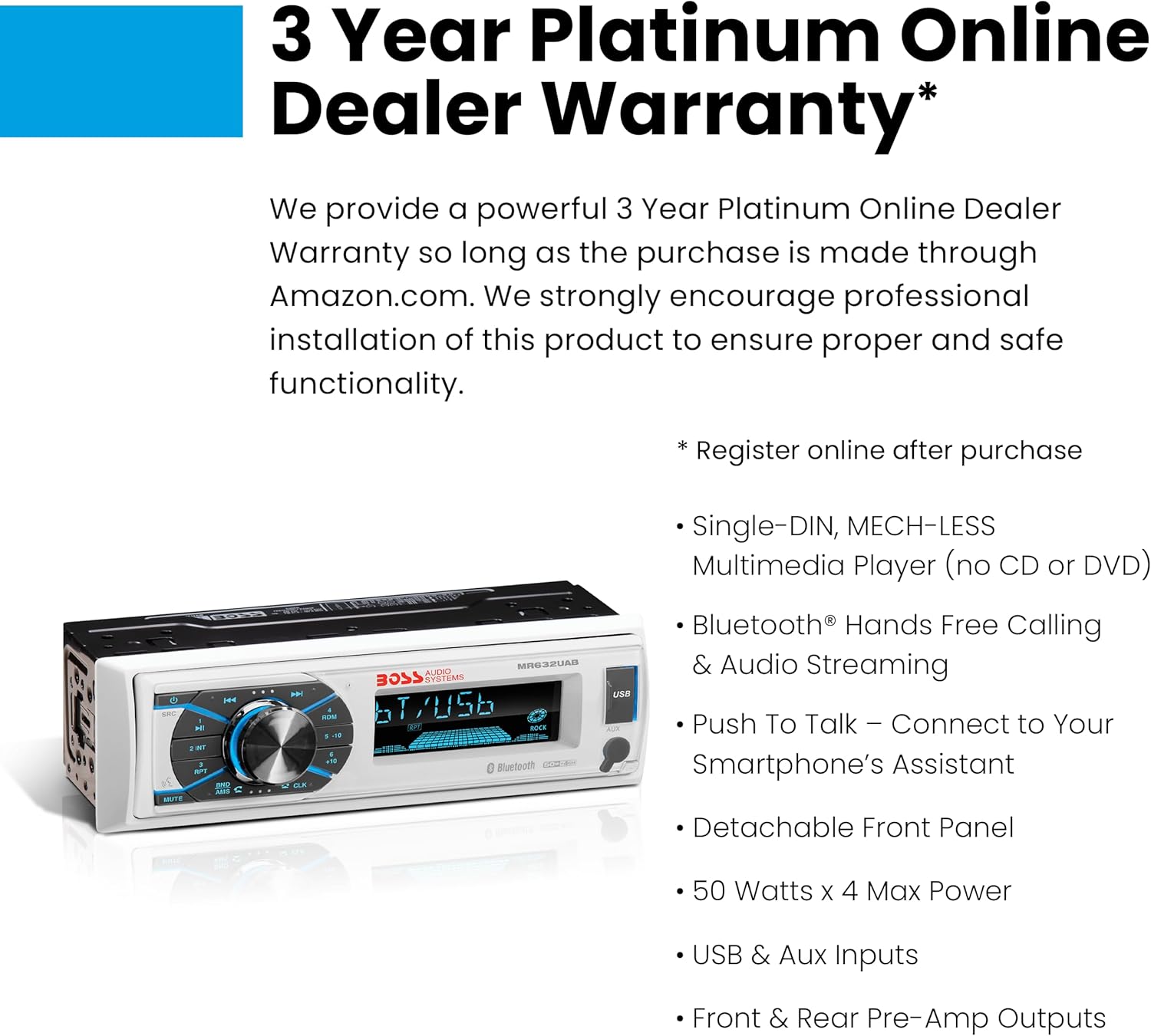 It’s smooth sailing with the BOSS Audio MR632UAB Weatherproof Mech-Less (No CD/DVD) Digital Media Player. Catch the latest tunes on the AM/FM radio or blast your digital music through your smartphone or MP3 Player hooked up to the Auxiliary Input. For even more options plug into the USB port and rock the boat with your own tunes. A wireless remote keeps you in control of all your music. Bluetooth technology lets you play and control your favorite music apps like Spotify and Pandora and make calls hands-free. State-of-the-art weatherproofing materials and special UV protection coatings provide resistance to corrosion and protection from the elements. Get the most out of your digital tunes with the BOSS Audio MR632UAB.