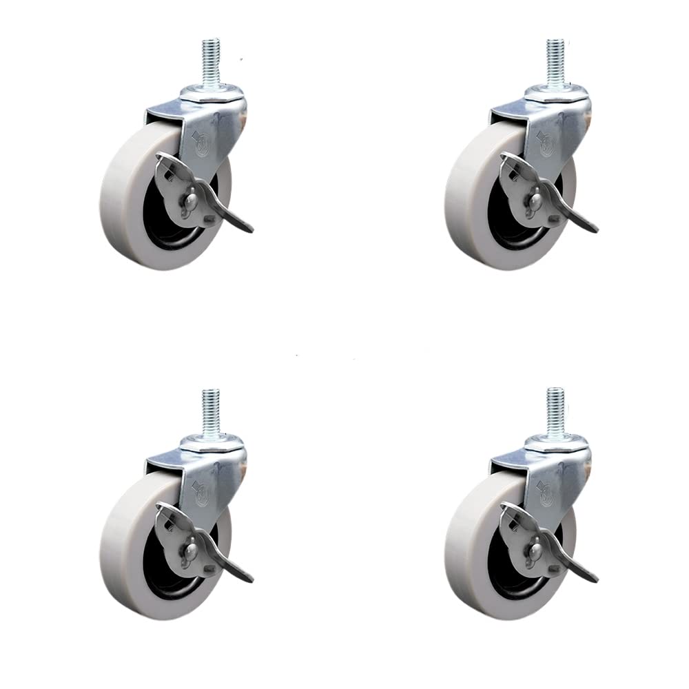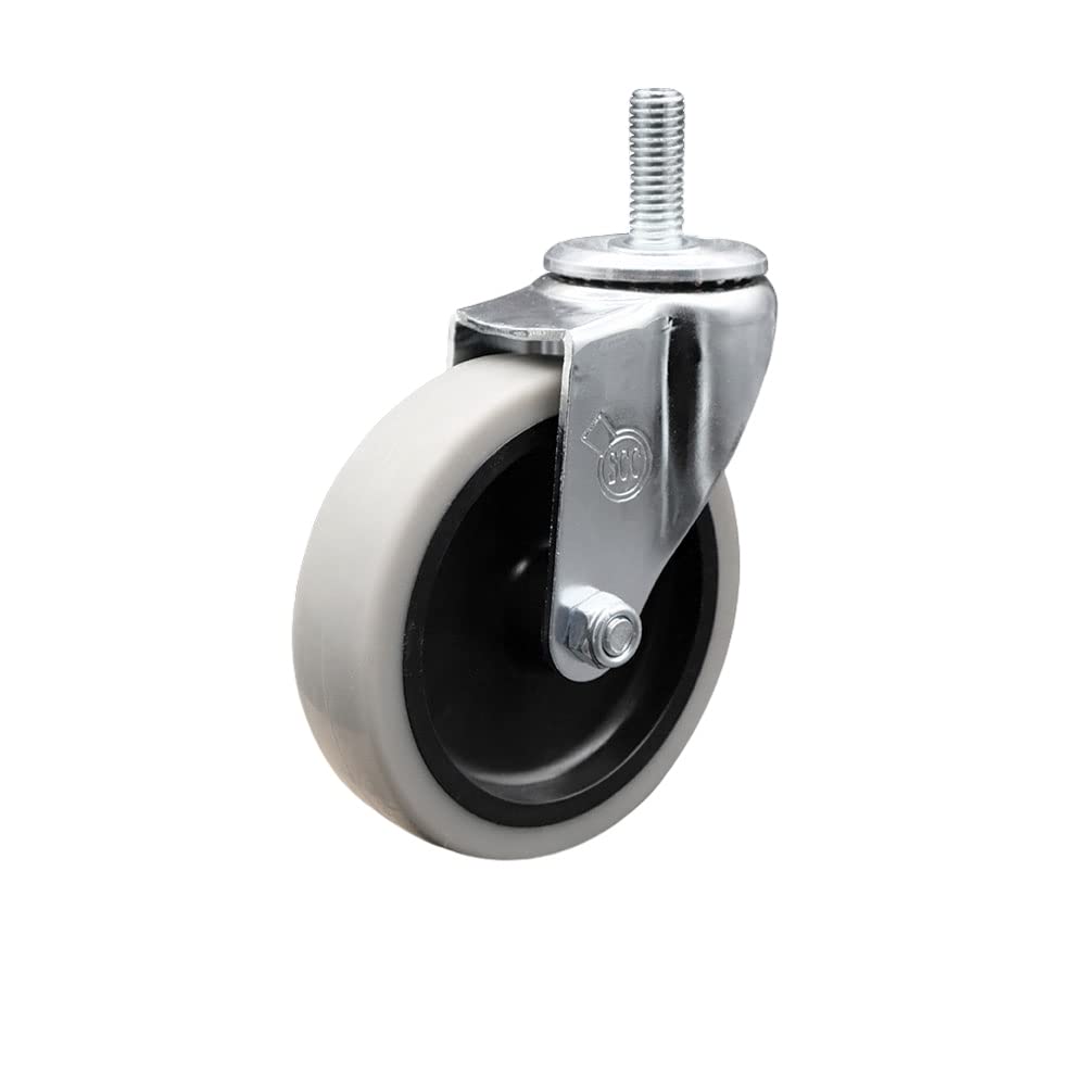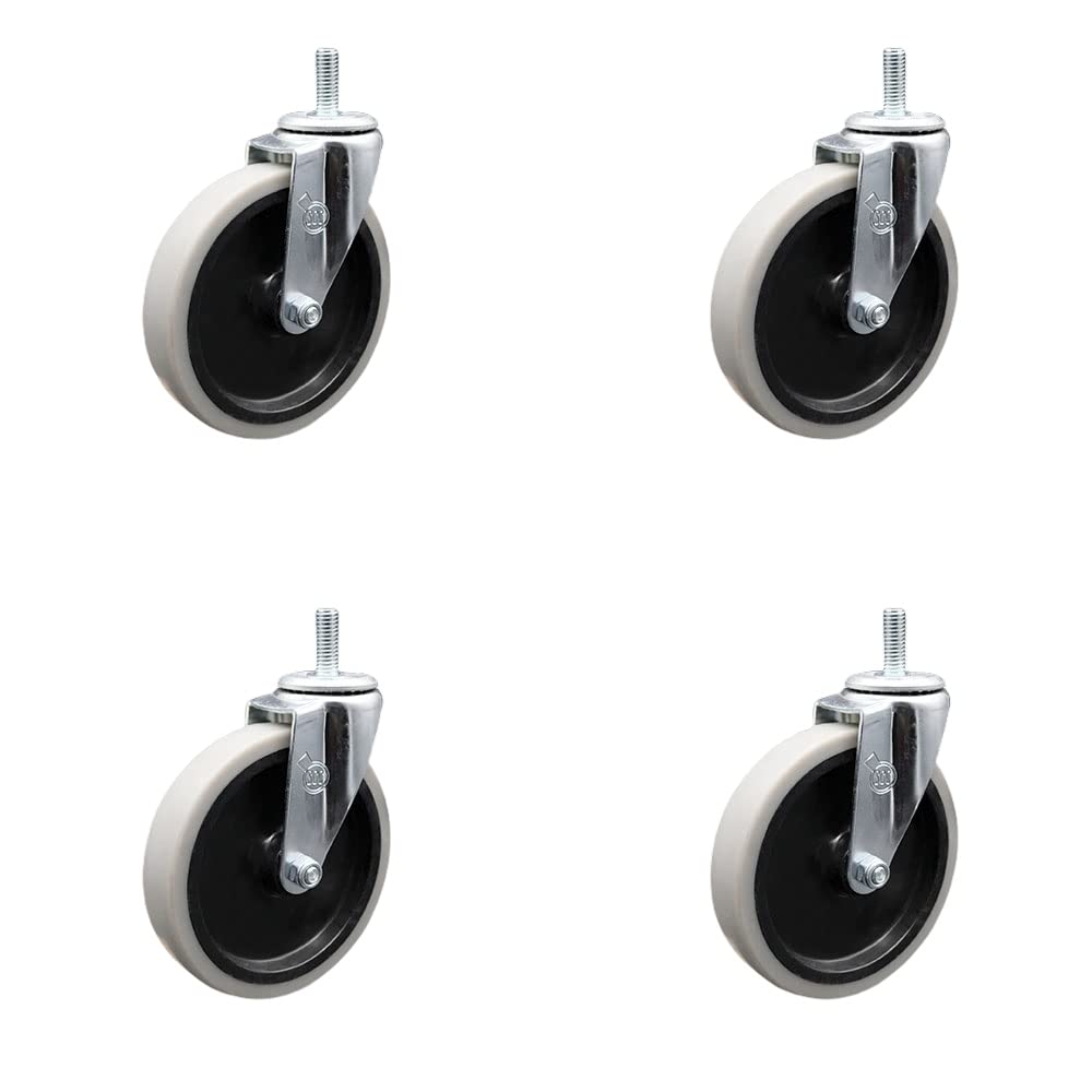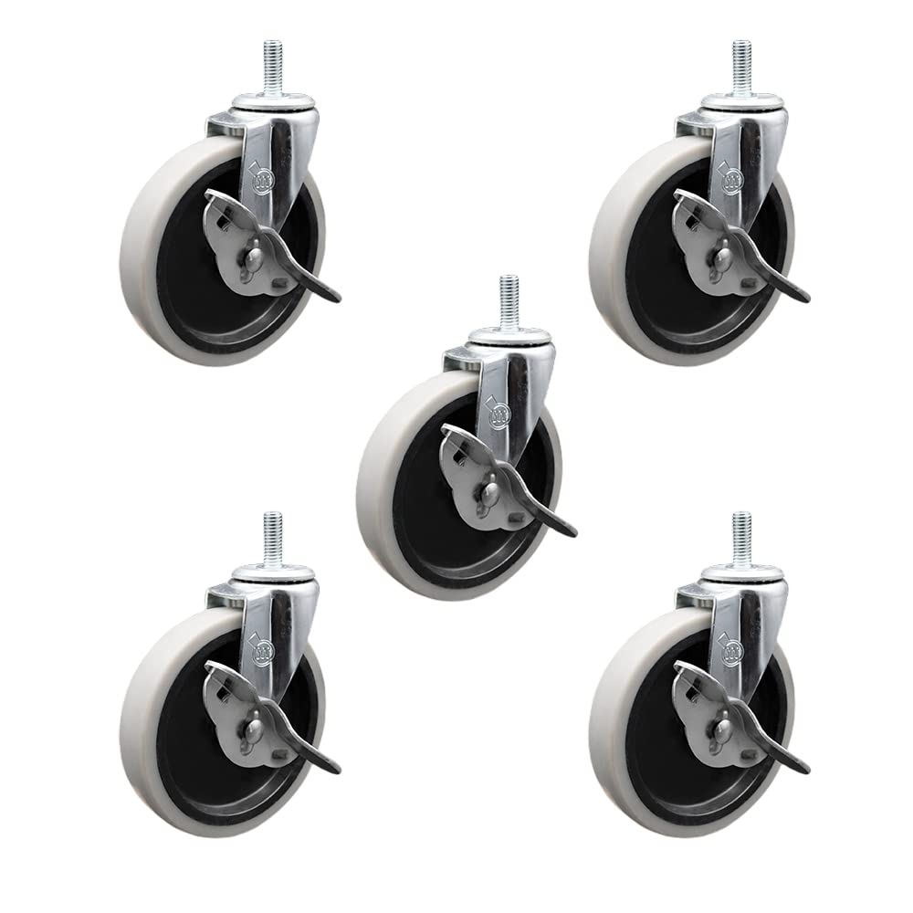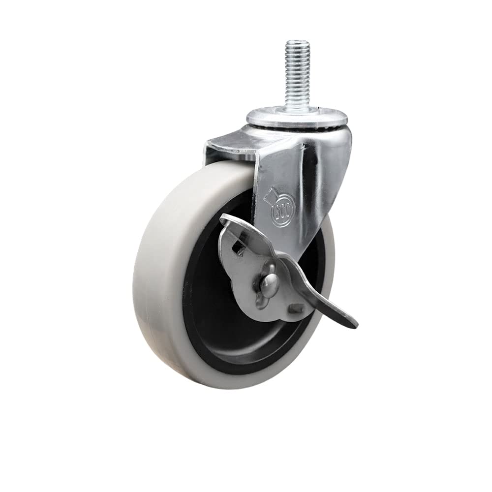 Listing is for four (4) 5" diameter thermoplastic rubber wheels and a 5/16” diameter – 18 TPI x 1.5” threaded stem with a side lock brake. Supports up to 130lbs per caster. When searching for a reliable and durable solution to your furniture needs, consider Service Caster’s Series 05 polyurethane, thermoplastic & soft rubber casters. The Service Caster 05 series is ideal for light duty applications, and is the perfect solution as new or replacement parts for chairs, tables, medical carts and other home and office furniture. This durable caster provides easy maneuverability for a smooth and quiet ride, and features dual ball bearing heat treated raceway construction, with a zinc plated finish that provides durability under any condition. Wheels are available in non-marking polyurethane, thermoplastic rubber and soft rubber, excellent for carpet, concrete and tile floor surfaces. Mounting options include top plate, grip neck, grip ring and standard and metric threaded stem sizes. Also, the innovative expanding stem, that can easily adapt to the inside diameter of an opening, allowing for a secure fit in round or square tubes.