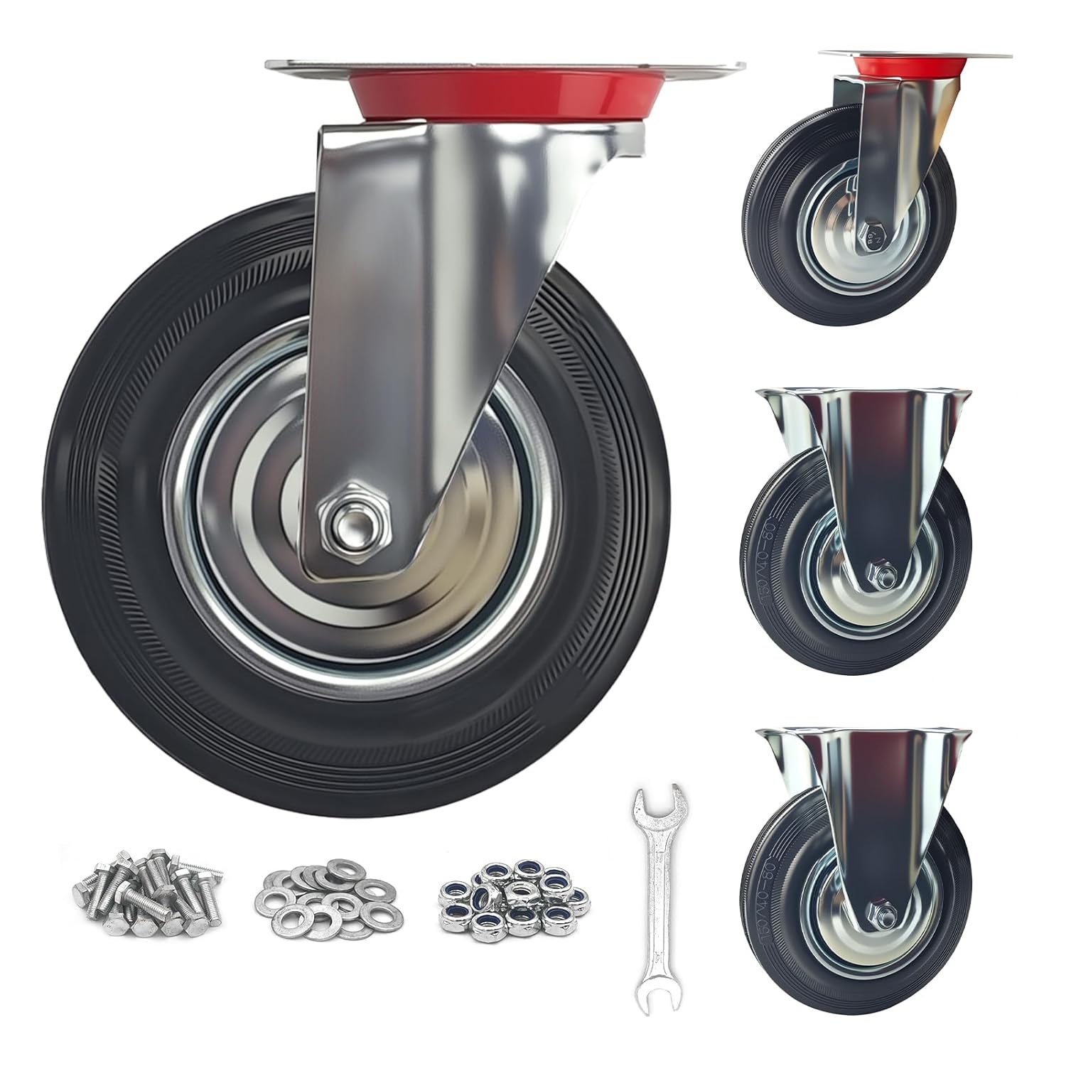 SHCBTRC Heavy Duty Caster Wheels Set - Move 3200 lbs with Ease, Conquer Any Terrain! Tired of the struggle and noise when moving heavy equipment? The SHCBTRC Heavy Duty Casters Set is your ultimate solution! This casters set of 4 includes 4 swivel casters, engineered for maximum performance and durability. Our 8 inch caster wheels feature high-quality solid rubber tires and thickened industrial-grade steel frames. They are puncture-proof, never require inflation, and provide exceptional shock absorption and quiet operation. Glide smoothly on hardwood floors, carpets, concrete, grass, gravel, and more. Ideal for heavy for furniture, industrial machinery, workbenches, carts, trolleys, chicken coops, and beyond, these casters make movement effortless. The swivel casters allow 360-degree maneuverability for easy navigation in tight spaces. With a remarkable capacity of 800 lbs per wheel and 3200 lbs for the heavy duty casters set, you can transport even the heaviest loads safely and reliably. Upgrade your mobility experience today—let SHCBTRC power your efficiency at home and work!