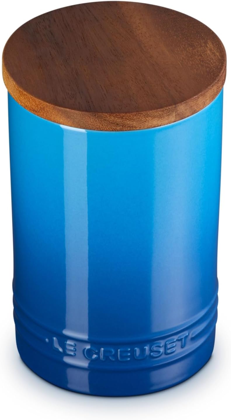 Available in four different sizes for maximum storage efficiency, these sleek, colorful Storage Canisters come with a tight-sealing acacia wood lid that allows for easy stacking on the counter or in cabinets. Air-tight silicone gaskets and a hard-wearing enamel finish make these canisters as functional as they are beautiful.