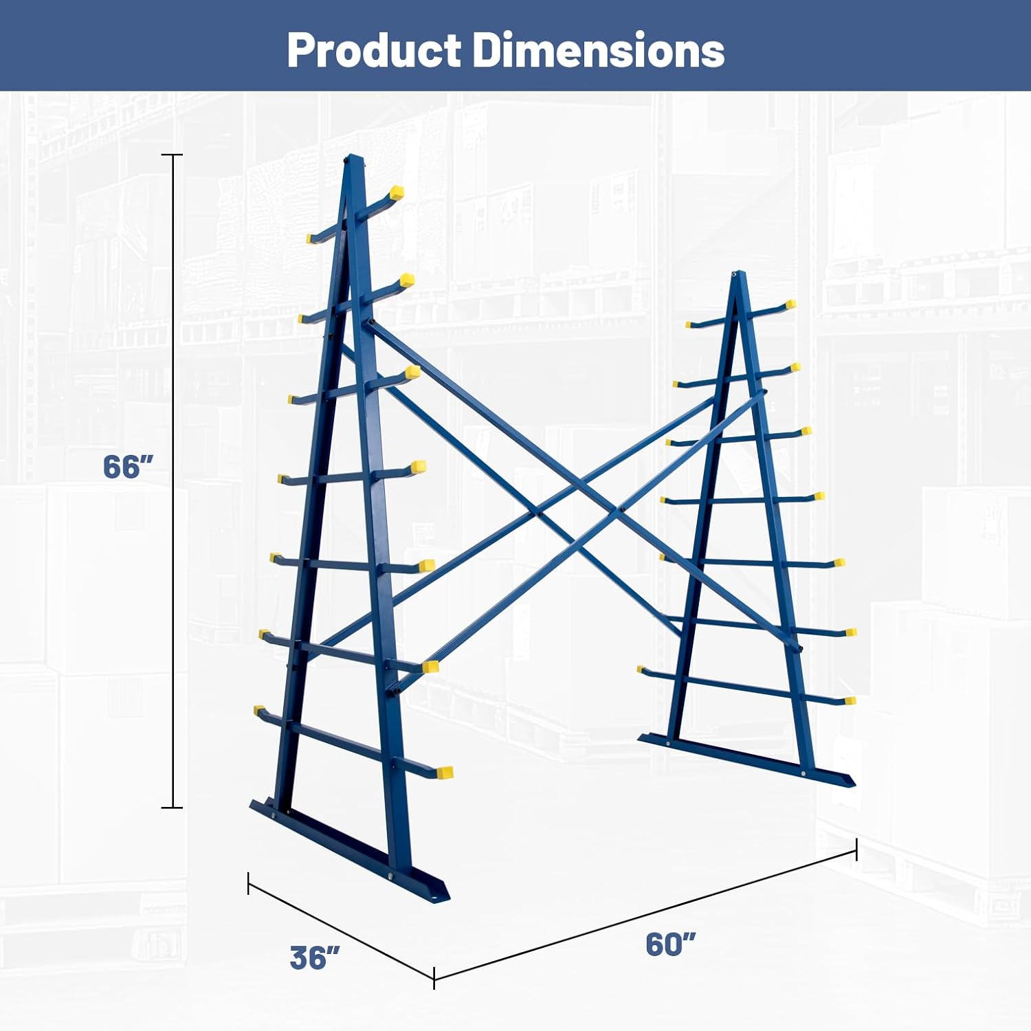 Advantages of Free Standing Cantilever Rack :- Arms adjust in or out.- Arm length is adjustable from 0 to 12in.- Arms can support user-supplied shelving.- Multiple units may be used for extra long storage.- Made of galvanized steel for corrosion protection.- Easy to assemble kit with all necessary hardware.- Compact design for minimal floor space.- Sturdy A-frame design supports a total of 2,000 lbs. of evenly distributed load.- Great for storing long items such as PVC, metal tubing, plumbing pipe, lumber, pipes, wood or plastic molding and more materials.7 arm levels with 8 in. vertical arm spacing. Each arm has two hooks with protective end caps on the end to contain materials at the front. To store a variety of materials, the front and rear sections of the rack arm can be adjusted to different length.Suitable for warehouses, factories, manufacturing facilities, sheds, and garages, this sturdy rack keeps long, slim parts organized in one compact location, such as PVC, metal tubing, plumbing pipe, wood or plastic molding and other materials