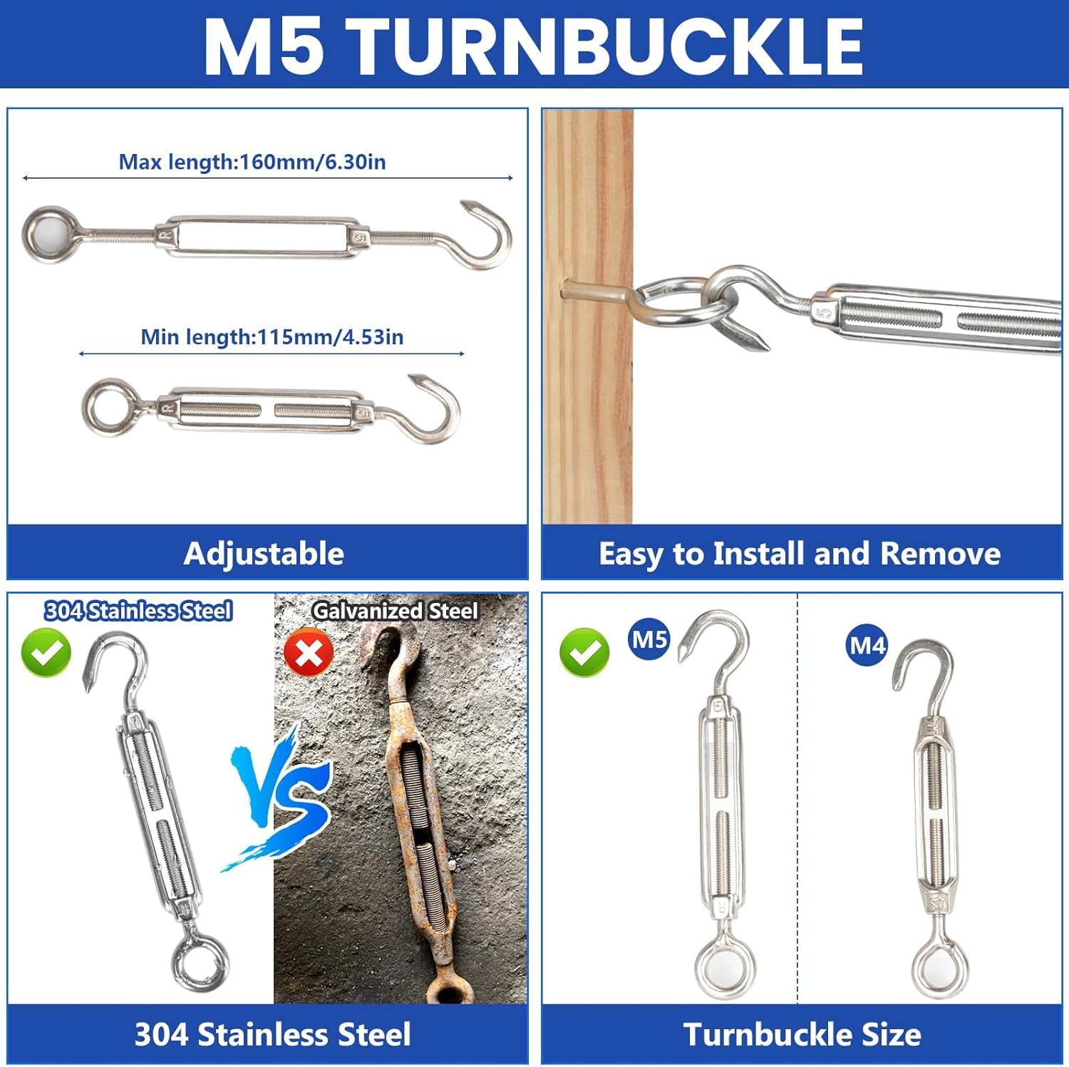 | Included Components | 100ft 3mm Stainless Steel Wire Rope Cable, 10× Vine Eyes Hook,12×1/8 Wire Rope Thimbles, 12×1/8 Stainless Steel Cable Clamps, 1× Wire Rope Clamp Tool., 14×1/8 Wire Rope Crimping Loop sleeves, 5×M5 Turnbuckle hook and eye |