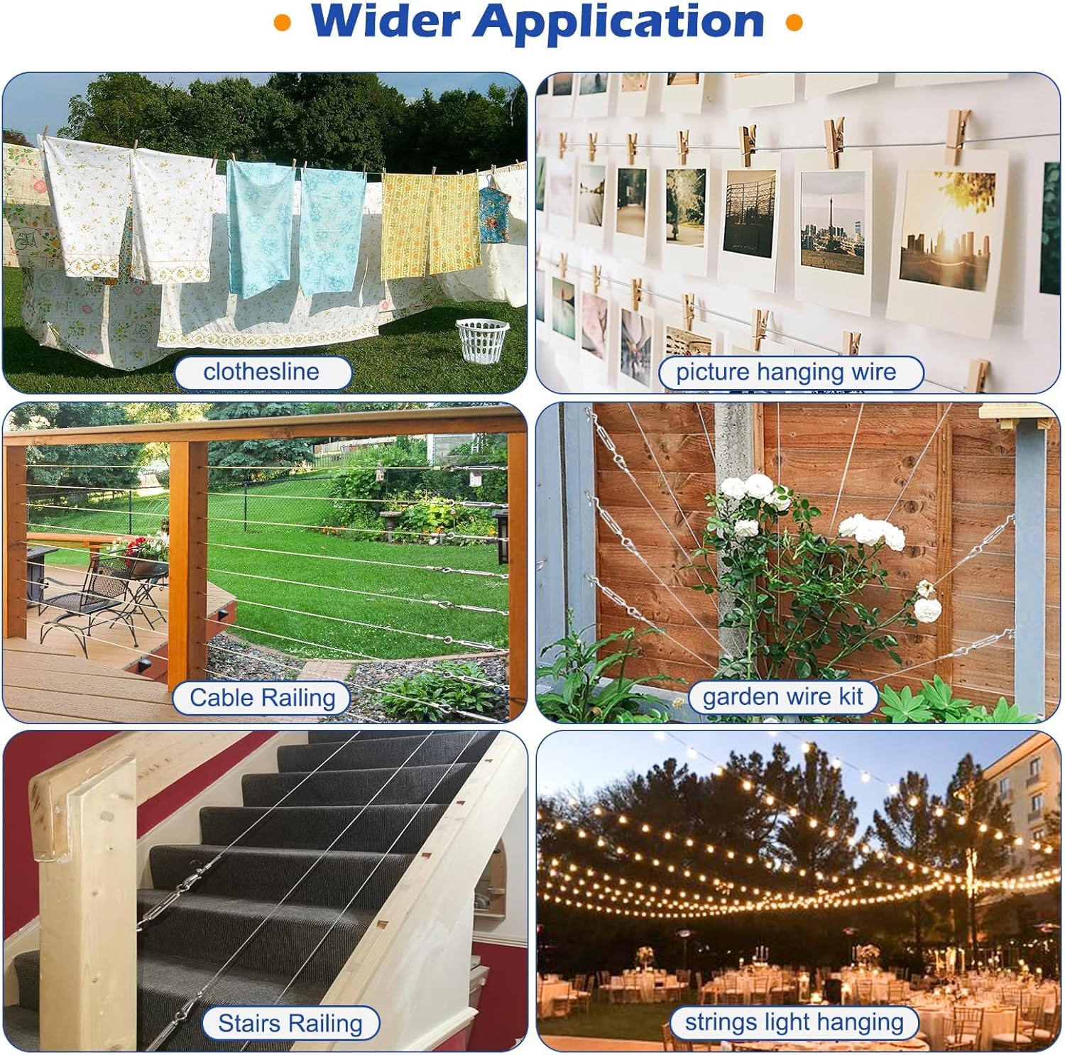 | Recommended Uses For Product | indoor outdoor hanging: outdoor string lights wire hanging kit, wire curtain hanging system, clothesline kit, laundry wire line, wire for hanging pictures, shade sail hardware kit; tension cable wire kit also use for DIY crafts, thick wire outdoor wire, fence wire, tension wire for chain link fence, cable railing kit, indoor stairs railing, guy wire kit, gate wire tension kit, anti sag gate kit, garage door cables, electric fence wire kit, garden wire: garden wire for climbing plants, wire trellis kit, espalier wire kit, catenary wire kit, gripple wire, rose wire |