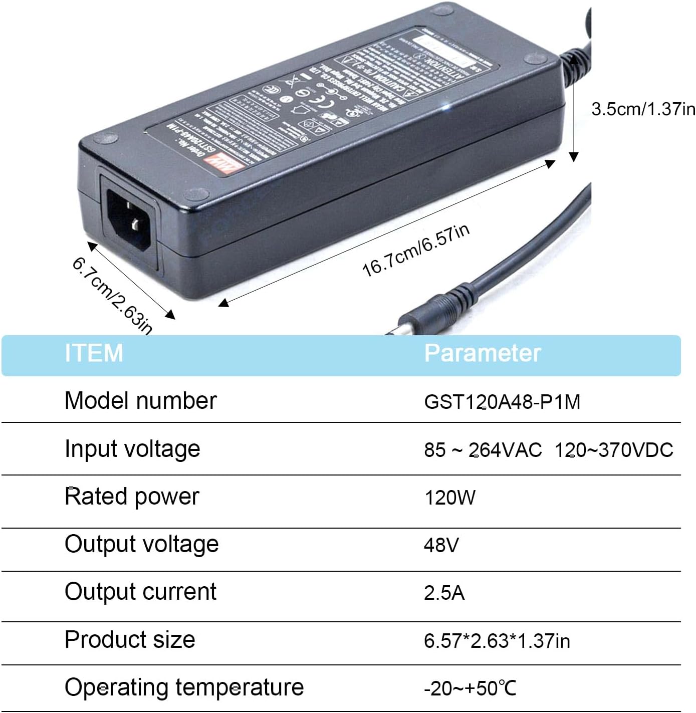 The DrapeMania GST120A48-P1M is a high-reliability, 120W single output enclosed power supply designed for demanding industrial applications. This unit delivers a stable 48V at 2.5A output and boasts an impressive 90.5% efficiency rating, minimizing energy waste and reducing operating costs.Built with a robust, fully enclosed plastic case, the GST120A48-P1M is engineered to withstand harsh environments. It can handle vibrations up to 5G and operates flawlessly in temperatures ranging from -22°F to +158°F (-30°C to +70°C). The fanless design ensures silent operation and enhances reliability. This DrapeMania power supply is similar in design and performance to power supplies.The GST120A48-P1M is compliant with a wide range of international safety and EMC standards, including UL, CUL, TUV, BSMI, CCC, PSE, CB, FCC, and CE. It features built-in protections against short circuits, overloads, overvoltage, and overheating, ensuring safe and reliable operation. This power supply is ideal for various applications such as industrial automation systems, LED lighting, control systems, and more.