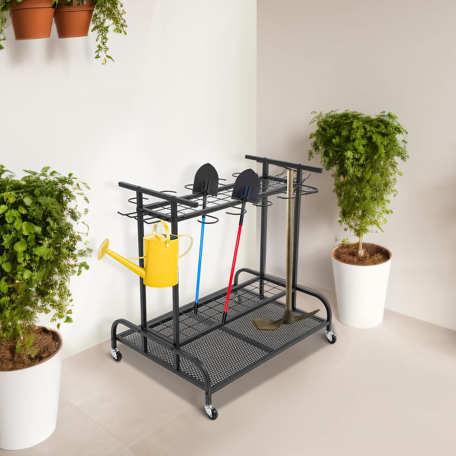 DescriptionTired of messy gardening tools? Dreaming of a tidy, organized garden space? Don't worry. Our garden tool organizer is exactly what you need! Crafted from premium material with a sturdy, large-capacity design, it transforms cluttered spaces into neat order, ushering in a pleasant gardening life.SpecificationsStyle: ModernMaterial: IronProcess: Baked PaintColor: BlackShape: RectangularAssembly Required: YesMounting Type: Free Standing Number of Universal Wheels: 4(2 With Brakes) Total Load Capacity: About 30-40kg/66.14-88.18 lbs Product Size: 73.5*55*75cm/28.94*21.65*29.53inPackage Size: 76*32*18cm/29.92*12.6*7.09inGross Weight: 8kg/17.64 lbsNet Weight: 7.6kg/16.76 lbsPackage Included1* Garden Tool Organizer4* Universal Wheels1* English Installation ManualAll Accessories for Installation Notes1. Please check the product size before ordering to make sure it fits your needs.2. Please use the product within its weight capacity to avoid damage.3. Please note that this product does not include other items shown in the picture.Please allow the slight color difference caused by the shooting light and 1-3cm error due to manual measurement, and make sure you do not mind before you order.