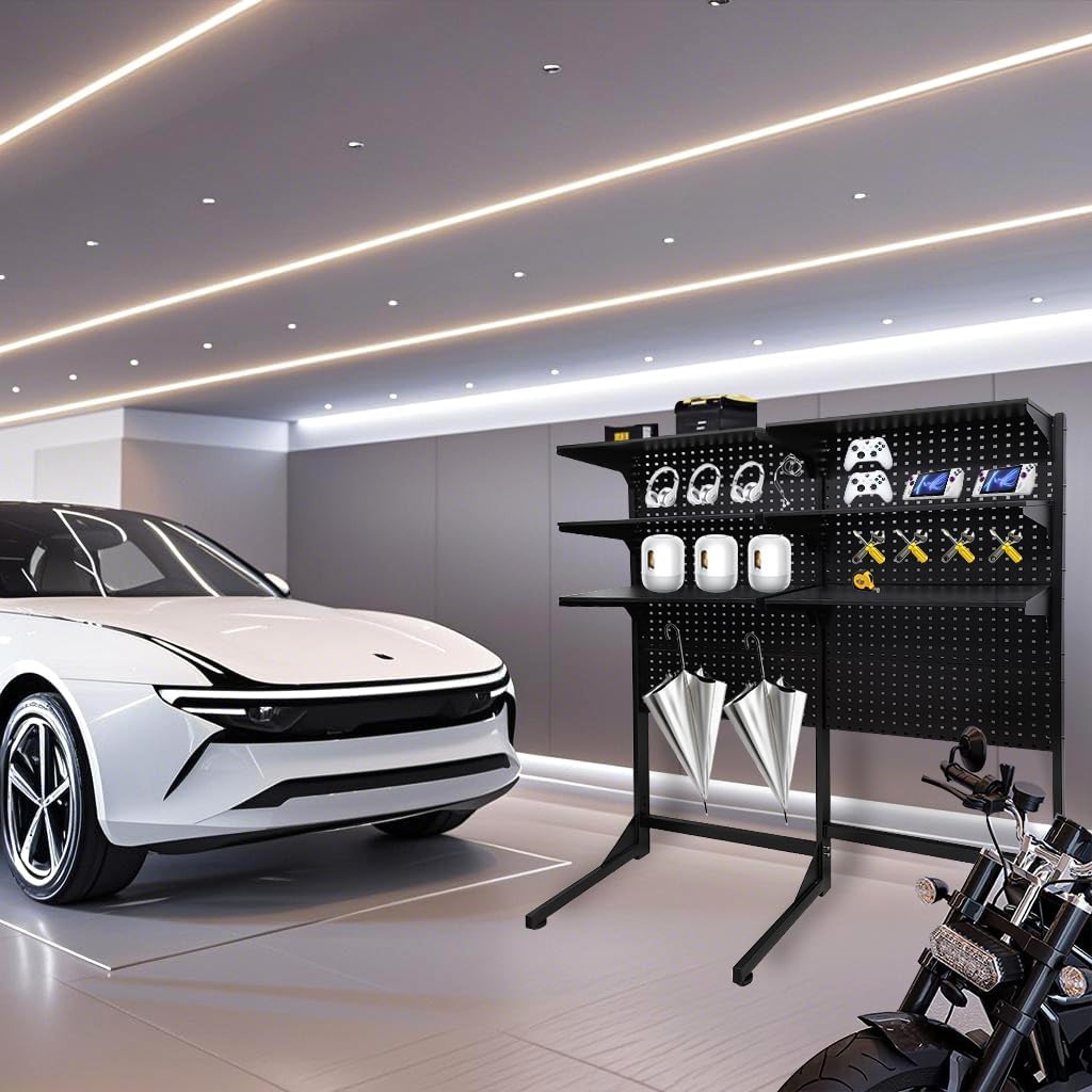 This is a steel shelf featuring two height-adjustable shelves and 50 hooks. The design allows you to customize it with various hooks based on your needs, making it convenient for organizing and displaying a wide range of items. It is highly suitable for supermarkets, convenience stores, garages, and many other settings.