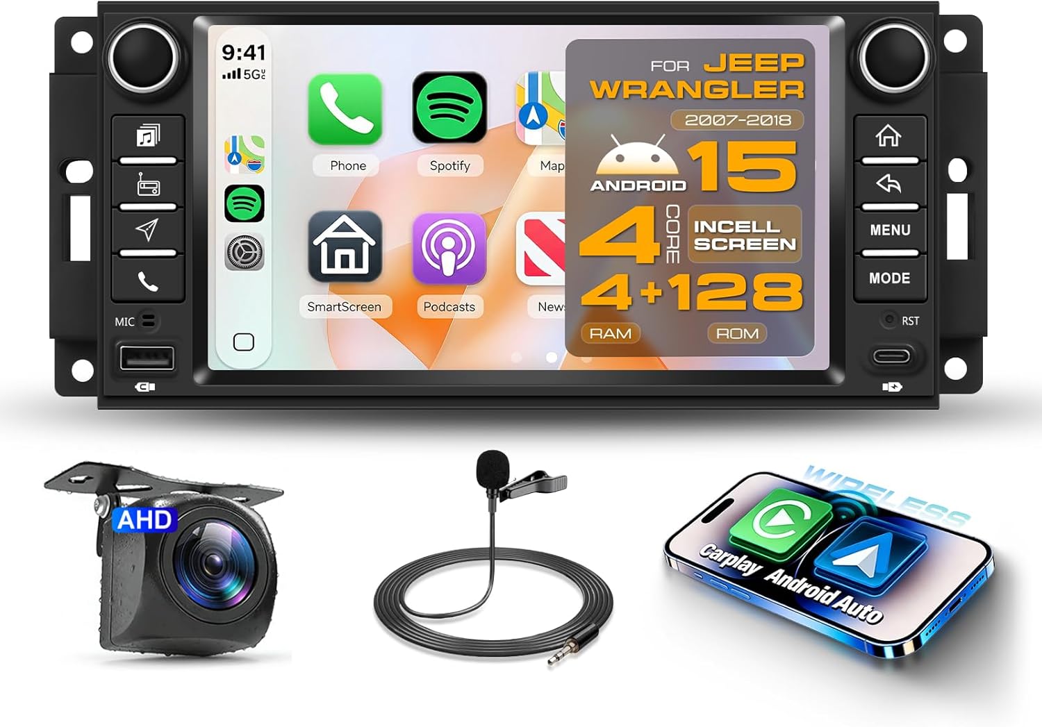 | BuiltIn Media | Jeep Wrangler JK Car Stereo, Backup Camera, Power Cable, RCA Cable, External Mic, Rear Camera Input Cable, 6pin USB Cable, Canbus, Radio Antenna, GPS Antenna, Installation Tool, Manual |