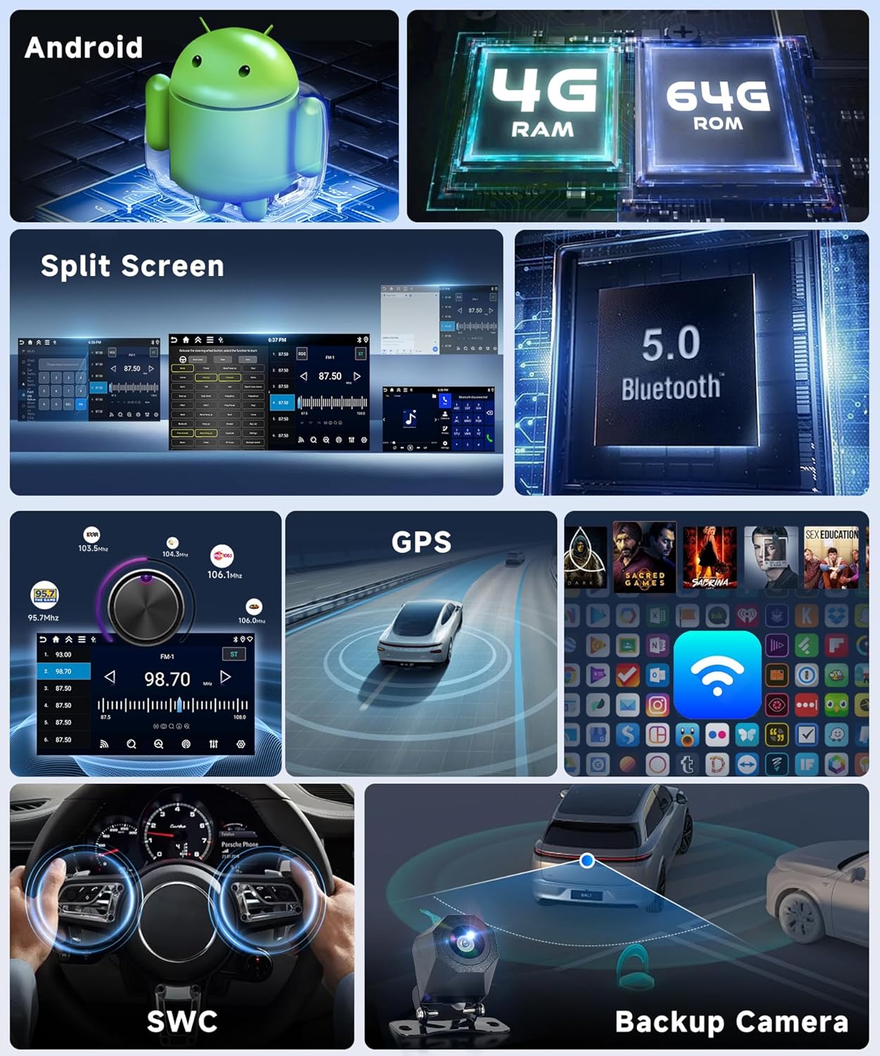 | Additional Features | Bluetooth, Quad Core 4G RAM+64G ROM, Touchscreen, Wireless Carplay Android Auto |