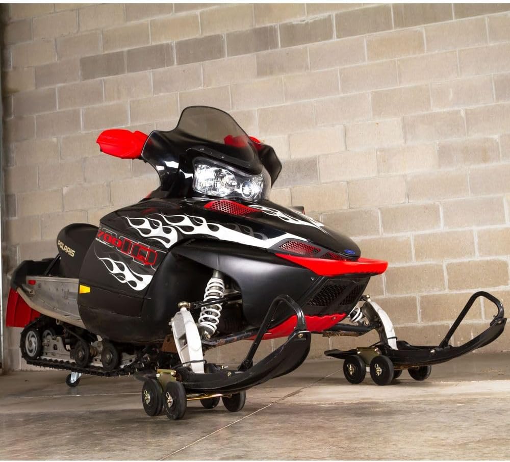 A must-have for any snowmobile owner, this set of all-terrain snowmobile wheel dollies allows you to manoeuvre your snowmobile over All types of terrain, from grass, to gravel or around your garage. Offering maximum versatility and durability, these wheel dollies help move your sled at up to 5Mph. This set includes 2 Ski dollies with a heavy-duty coated steel cable strap, and a track Dolly. Featuring easy roll 360 degree Rotation capacity, you can easily manoeuvre your sled around your garage shop or into a trailer.