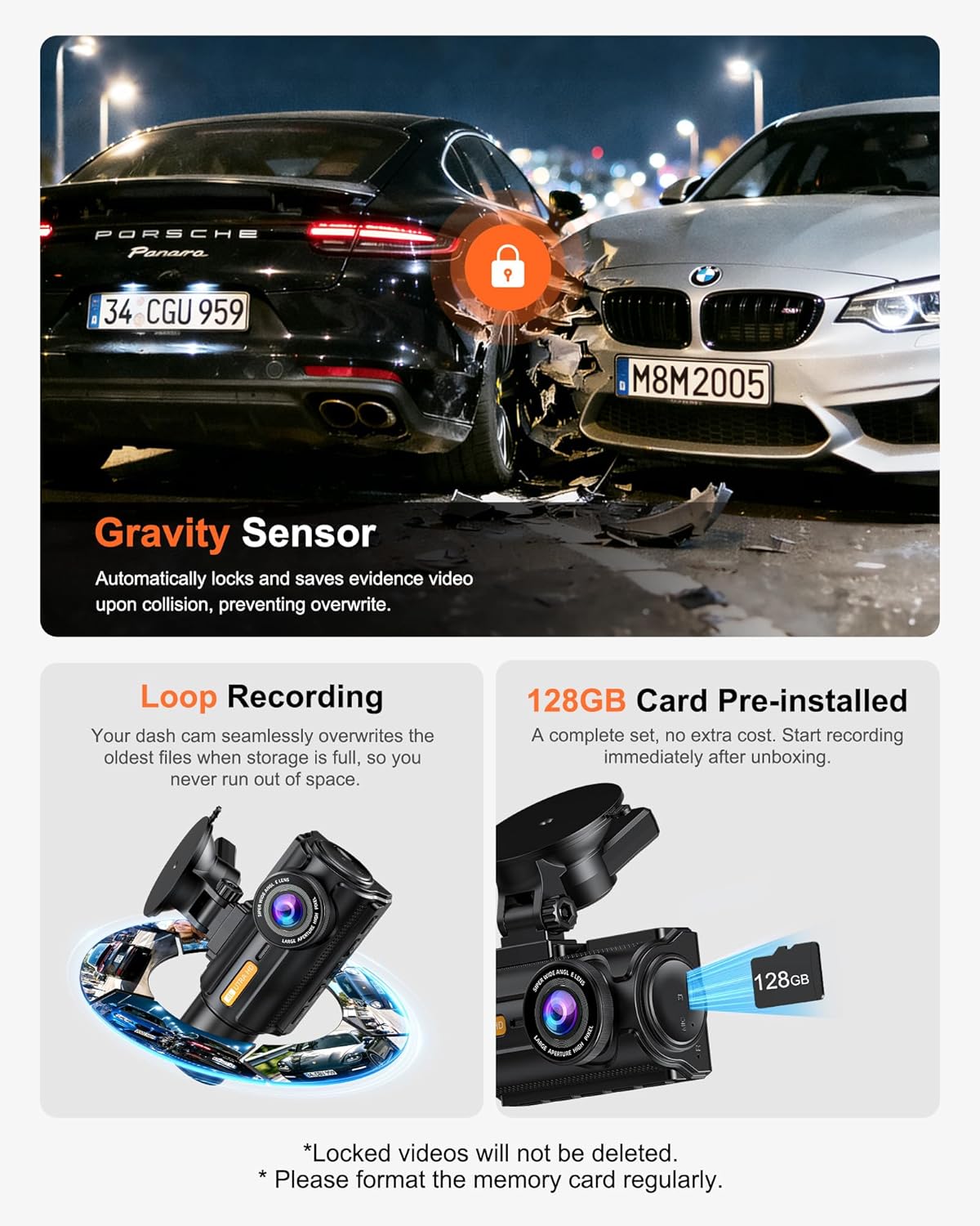 | BuiltIn Media | 2K Rear Camera, 4K Front Dash Cam, Adhesive Pads & Screws & Electrostatic Film, Type-C Power Cable & Wiring Trim Tool, User Manual & 128GB TF Card |