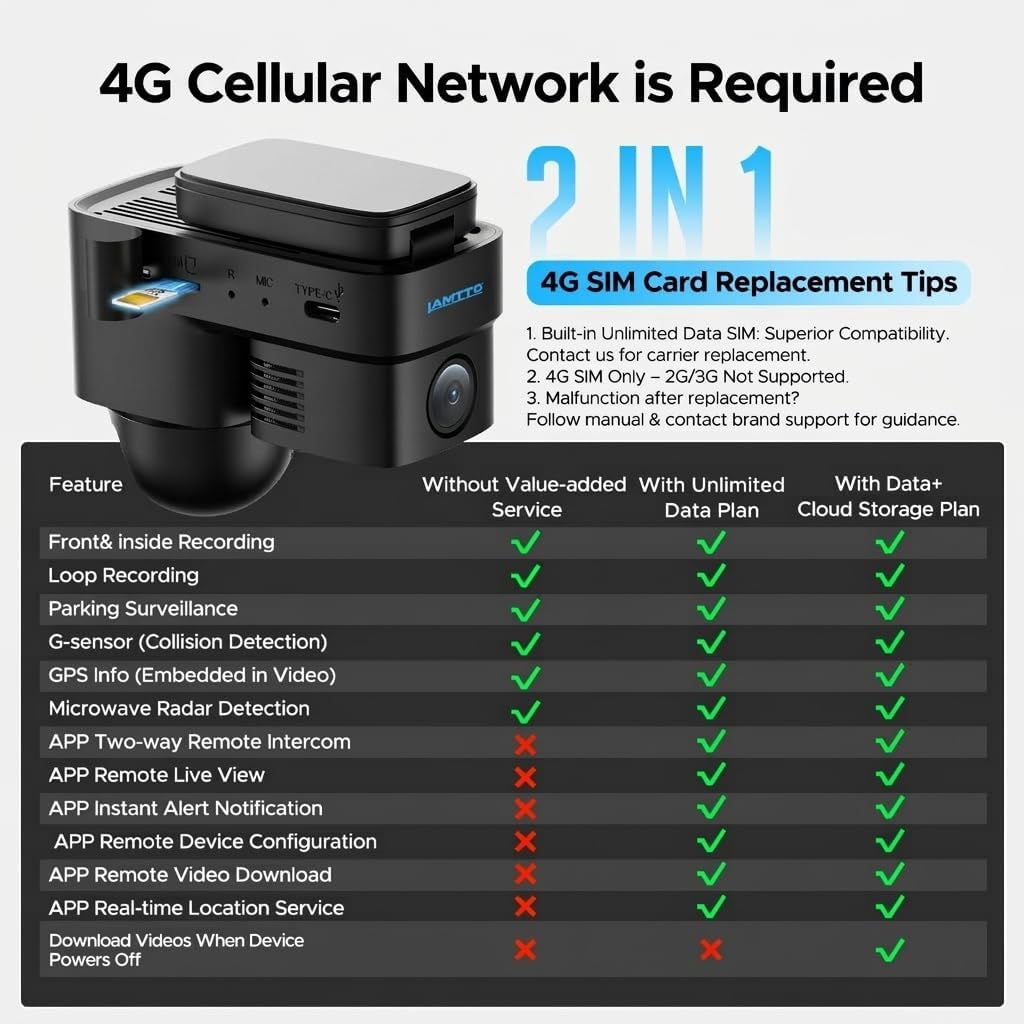| Other Special Features of the Product | Car Owners Concerned About Theft/Vandalism – Need 24/7 protection → Radar and G-sensor alerts with cloud upload protect your car even when parked, Fleet Managers & Commercial Drivers – Need real-time tracking and driver oversight → 4G GPS tracking and two-way voice keep your fleet connected and secure, Insurance-Conscious Drivers – Need solid evidence → Cloud-stored, GPS-tagged footage ensures reliable proof for claims, Parents of Teen Drivers – Need peace of mind → Live-view, GPS history, and voice call let you check in anytime for safety, Tech Enthusiasts & Early Adopters – Want cutting-edge smart features → 4G LTE connectivity, motion sensing, and lifetime support deliver a next-gen dash cam experience |