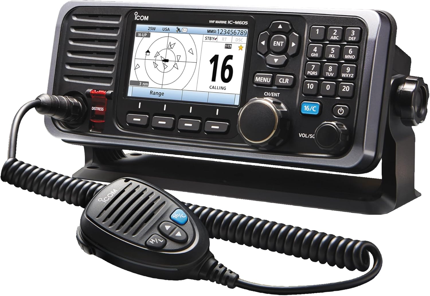 The Icon M605 11 is a fixed mount VHF radio with 25W output power and is IPXS waterproof rated. The M605 includes a built-in horn/foghorn, 30W listen back hailer and a GNSS antenna.
