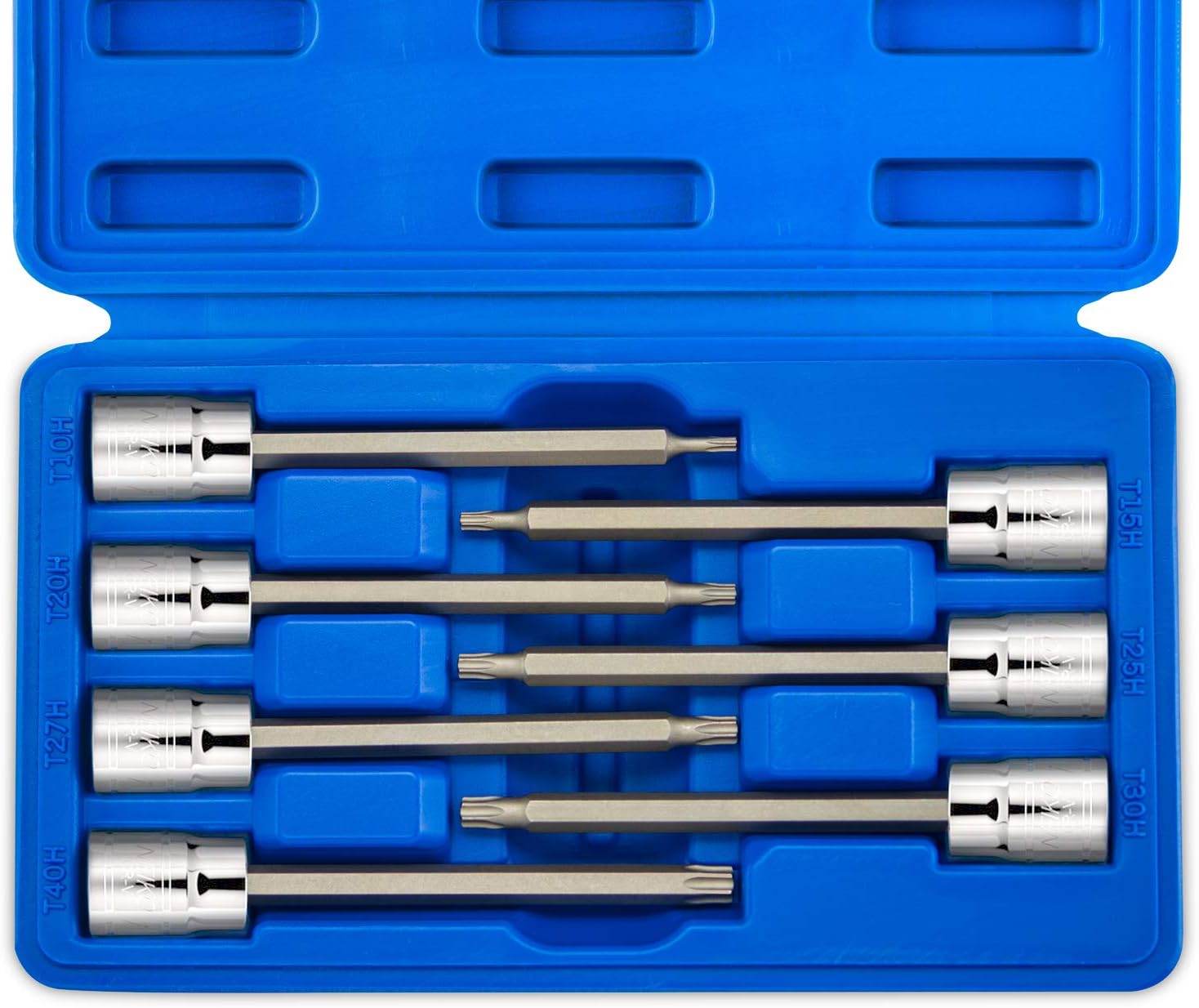 High-strength chrome moly steel construction and precisely milled tips deliver premium performance with an exact fit in fastener head. These tools are designed to be used with impact drivers to free rusted and overtightened bolts. Set Includes: 8-piece 1/2-inch drive Torx driver impact sockets: T30, T40, T45, T47, T50, T55, T60, T70. Storage and carrying case included.