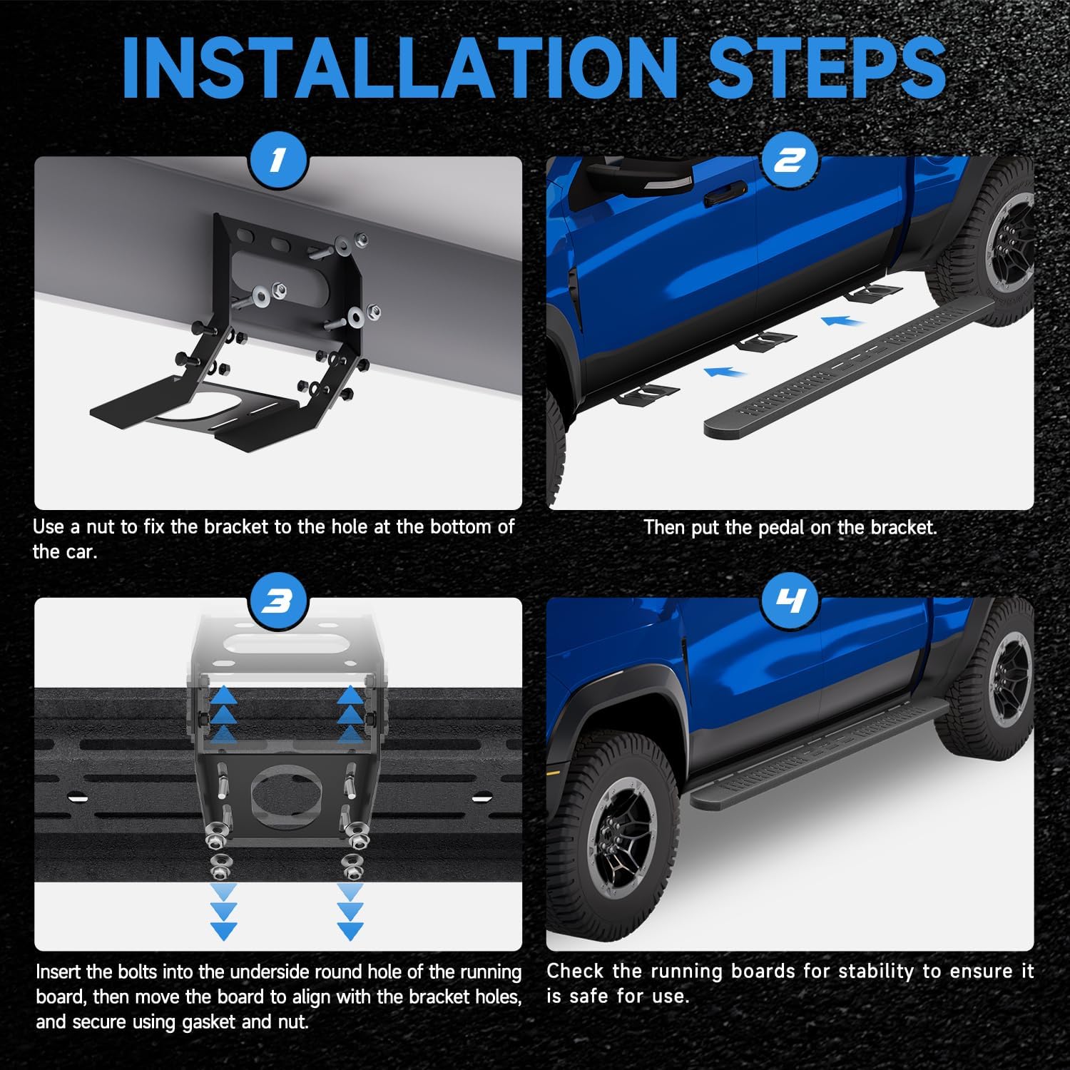 | Included Components | 2x Running Boards,6x Brackets,42x Nuts,42x Screws,42x Gaskets,24Set Black Screw kit(For connecting brackets) |