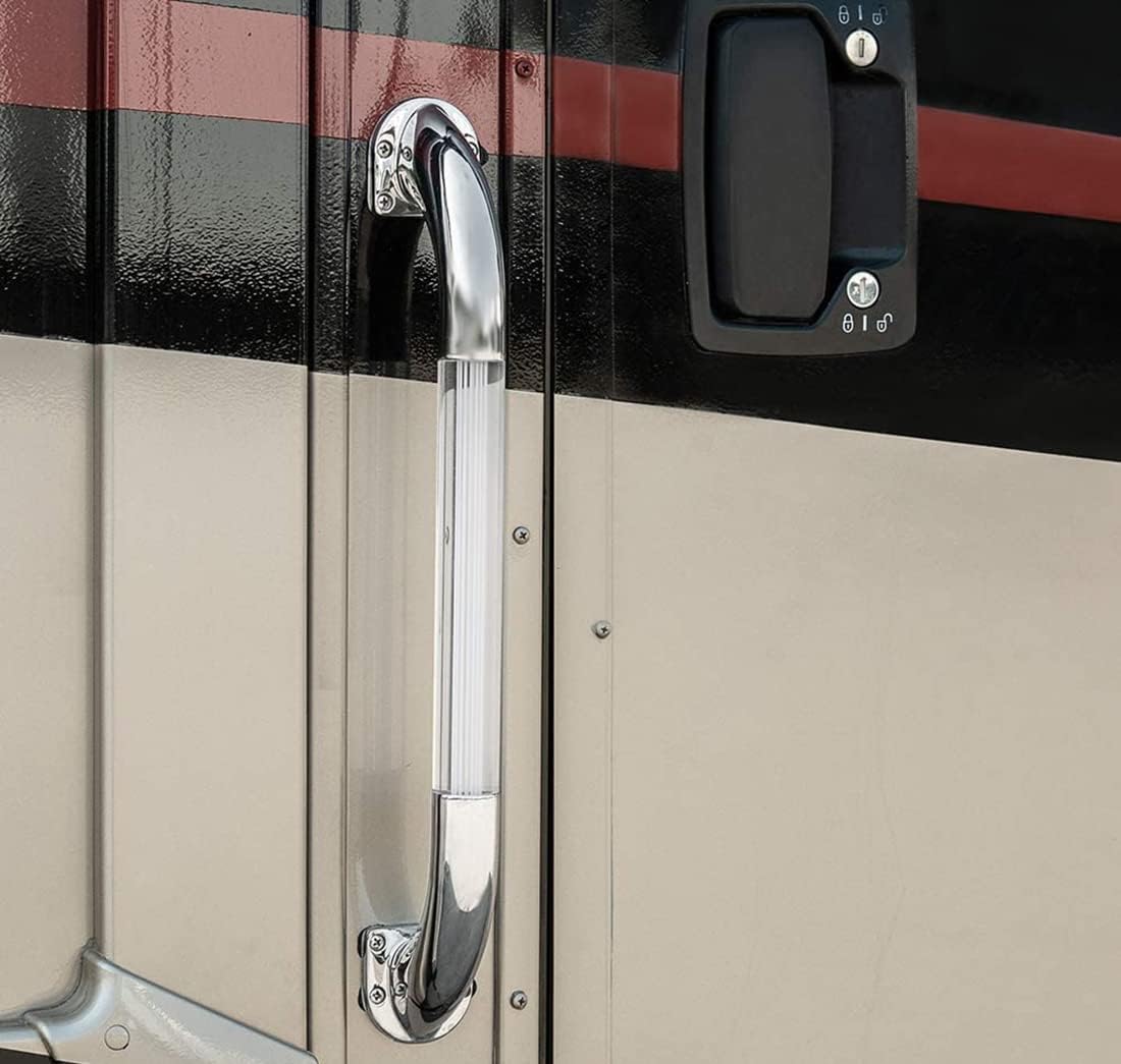 This RV assist handle is lit for safety. This sleek RV or boat assist handle comes in highly polished corrosion resistant 304 stainless steel. Handle provides style and safety for your RV or boat. End caps feature four mounting holes for simple installation (does not come with screws - please use the best attachment for the surface you are attaching to). The 1.25" diameter lit acrylic features embedded highly reflective lines. Built for safety and performance tested, this assist handle pull exceeds 350 pounds of strength (when installed per directions and correct attachment is used for substrate), providing an ample amount of support when entering and exiting your RV or Boat. package: 1* assist handle with LED light