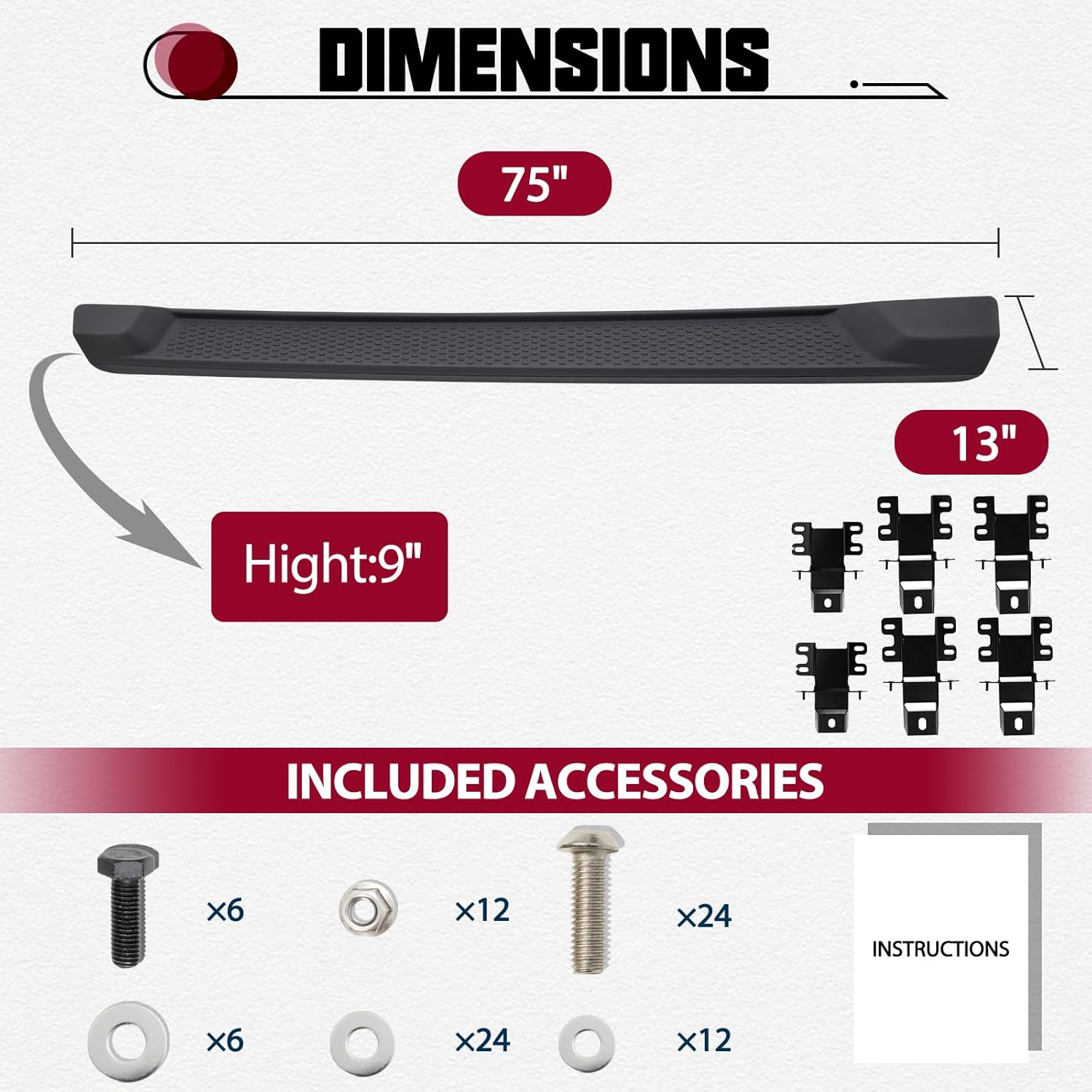 | Included Components | 2 x Side Steps; Mounting Brackets; Mounting Screws |