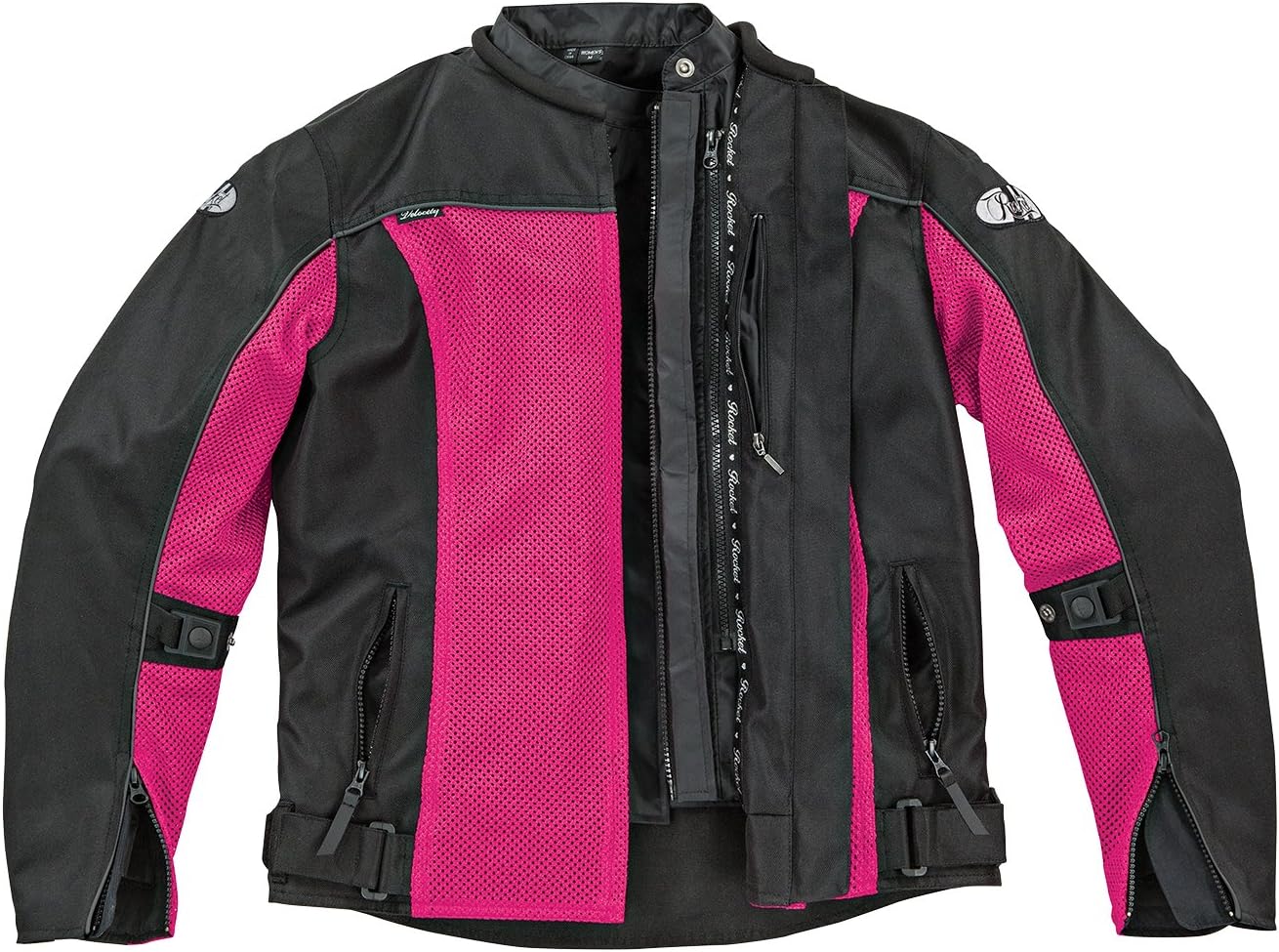 The Joe Rocket Velocity Women's Pink and Black Mesh Jacket offers exceptional value without compromising protection, versatility, style, or summer comfort. This bestselling hot weather riding jacket combines effective FreeAir mesh with an affordable price. It features Joe Rocket's proven design elements like the 6-point SureFit system and a waterproof liner. Order now from LeatherUp, the leading online motorcycle store. Key features include: Cooling FreeAir mesh shell, Rock Tex reinforcement, removable waterproof full sleeve liner, contoured armor, removable dual density spine pad, 6 point Sure Fit system, two outside pockets, one inside pocket, and reflective stripes and logos.