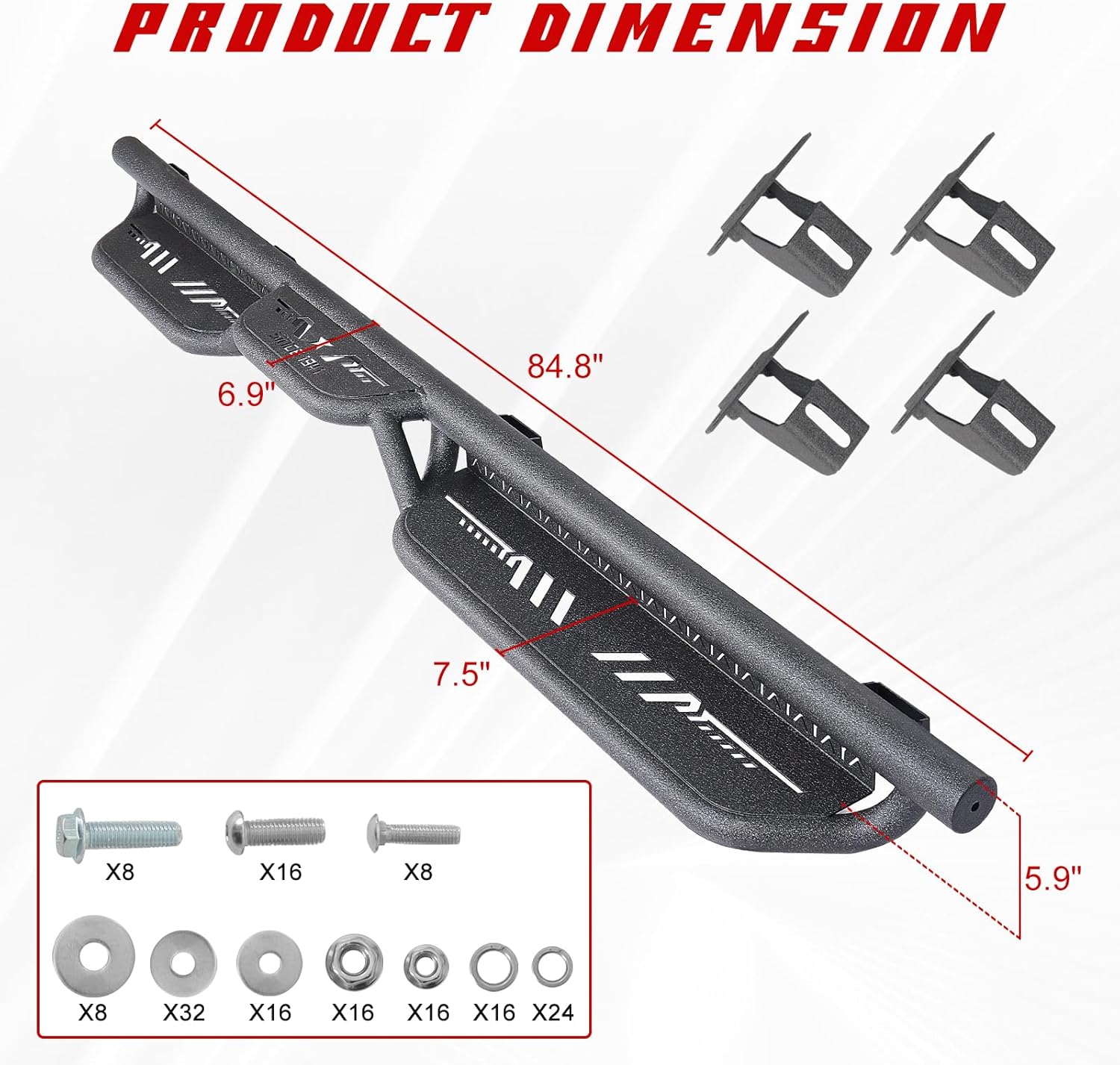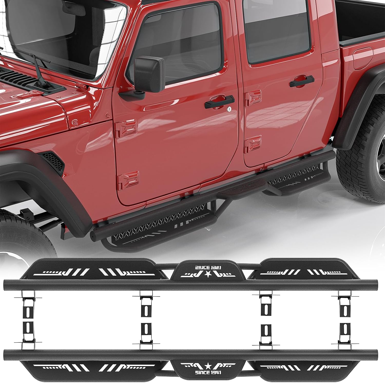 【Skeleton Design】The unique “Since 1941” logo and “Star” pattern add a stylish and modern look to your car. The innovative cut-out design prevents rain, dust, sand and snow from intruding into the cab, providing you with a safe and stable foothold and reducing wind resistance while driving 【Dual Staircase Layout】Dual staircase layout provides better convenience for vehicles equipped with lift kit and oversized tires. The raised center step makes it easy to put luggage or items on the roof and is designed for those who want to conquer the rugged and rocky terrain of the outdoors