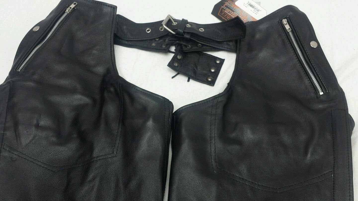 MEN'S MOTORCYCLE MOTORBIKE BLACK LEATHER RIDING CHAP PANTS SOFT NEW BLACKMEN'S BLACK FOUR POCKET THERMAL LINED CHAPUNBEATABLE PRICEPREMIUM NAKED COWHIDE LEATHER 1.3-1.4 MM THICK DUAL SIDED ZIPPER & SNAP DOUBLE THIGH STORAGE POCKETS FULLY REMOVABLE SNAP OUT COLD WEATHER THERMAL LINER FOR ALL SEASON RIDING MESH LINER UNDER THERMAL FOR SUMMER RIDING INNER THIGH STRETCH PANEL FOR OPTIMAL FITMEN'S CHAP SIZING CHART PLEASE FOLLOW THE SIZING CHARTTYPE3XS2XSXSSMLXL2XL3XL4XL5XLTHIGH18?19?20?21?22?23?24?25?26?27?28?INSEAMWAIST32.25?26-3432.5?26-3432.75?26-3433?26-3433.25?28-3833.5?32-4233.75?32-4234?34-4434.25?36-4634.5?38-4834.75?40-50About Us About Us Thanks for rolling in to bikersgearonline, your home for top quality leather vests, jackets, chaps at extremely affordable prices. Based out of Middletown, New York, we have developed a reputation in the Biker world for designing and manufacturing the most comfortable and durable men's and women's motorcycle apparel you'll find anywhere, making us your perfect source for all your leathers, whether you're an MC member in good standing or just a person who likes firing up the Harley for a weekend run. We also offer a diverse selection of saddlebags, roll bags and the rain gear you need to power right through whatever Mother Nature throws at you. Exported By ExportYourStore
