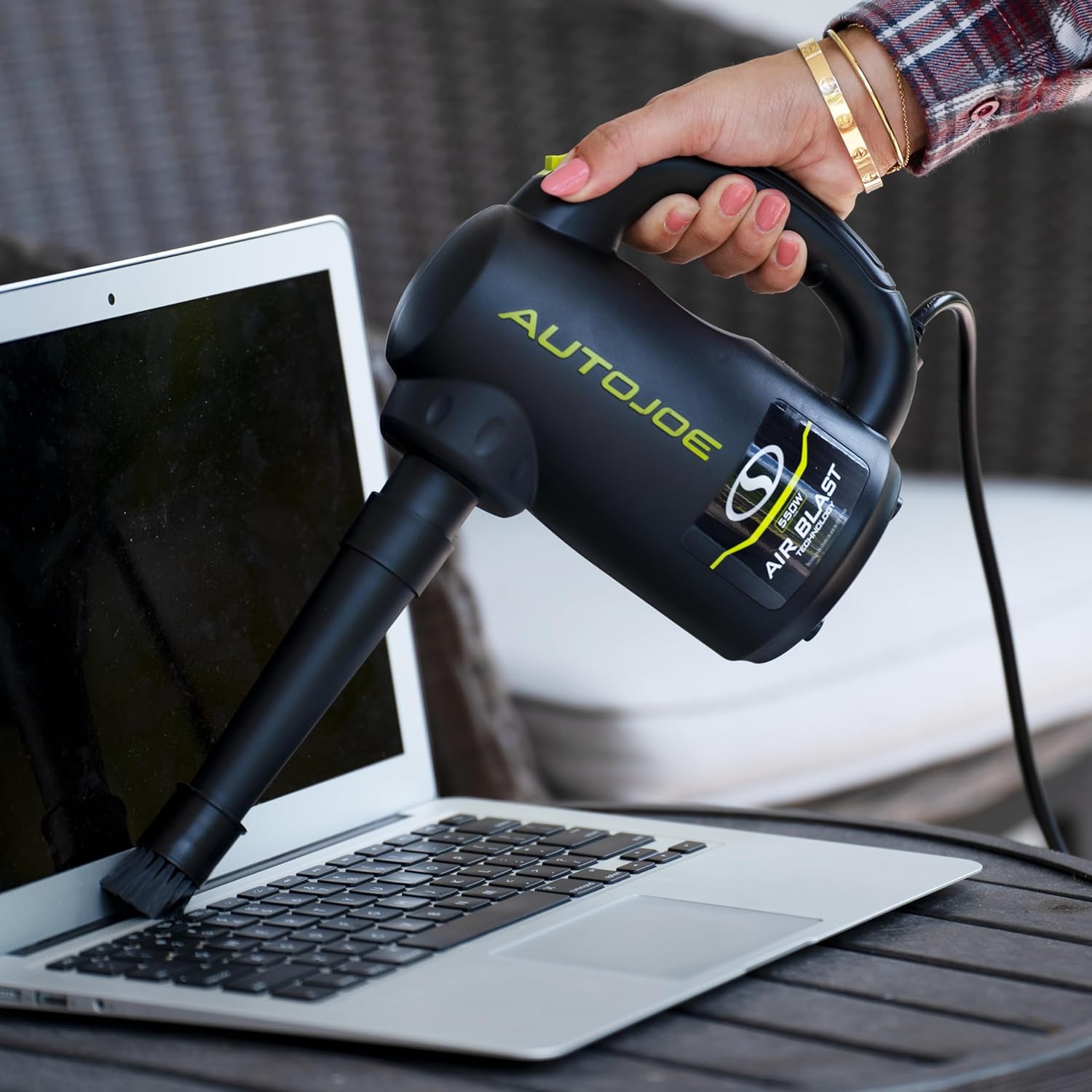 MAKE CLEANING A BREEZE. Say goodbye to water spots and streaks with the Electric Dryer + Inflator by Auto Joe. An essential tool for any car owner, Auto Joe expels water + dries hard-to-reach areas on your car, truck, motorcycle, and RV with a concentrated stream of air for that streak-free showroom shine. Perfect for the car and home, the powerful 550W motor is easy and safe to use with two speed settings to blast away dust, debris and quickly dry damp surfaces. Able to inflate a twin air mattress in just 30 seconds, AUTO JOE also includes a 9-pc accessory kit to quickly remove dirt + debris from window blinds, in keyboards, electronics, on auto dashboards + consoles, in the workshop, appliances – and even doubles as a gentle dryer for pets!