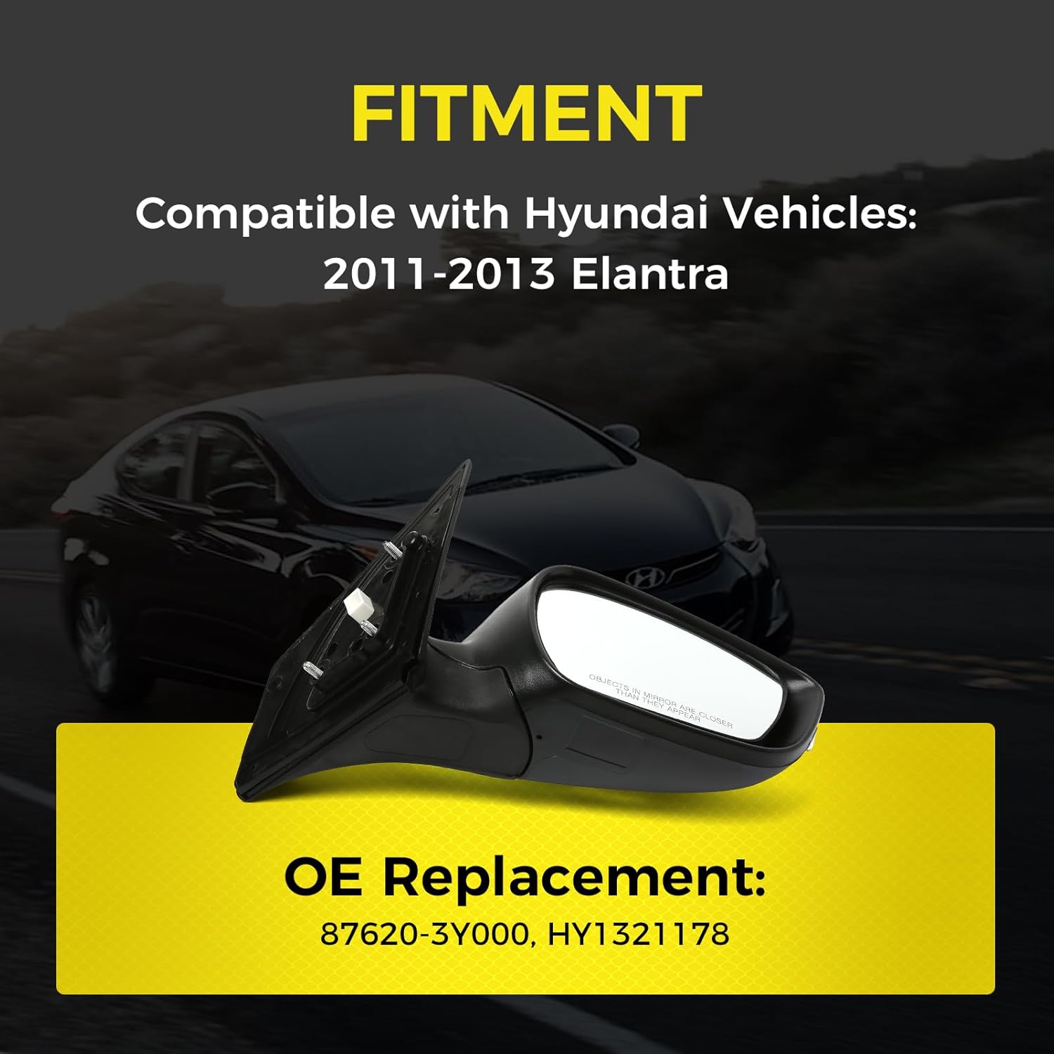 Product Overview:This passenger-side (Right/RH) side view mirror is engineered for Hyundai Elantra 2011-2013. It restores clear rearward visibility and OE-style appearance while matching the factory wiring and functions. Also known as a door mirror or outside mirror.Key Features:Power glass adjustment for quick, precise aimingIntegrated turn signal for added on-road visibilityHeated mirror glass clears fog and light ice quickly6-pin connector that matches the original harnessWhite textured housing blends cleanly with factory trimOE-style Look & Durability:Impact-resistant ABS housing and a clear, fade-resistant lens stand up to daily driving, weather, and road debris. The mirror glass size and curvature follow OE specs for a natural field of view.Confirm Your Options:Before ordering, match the features on your original side mirror: passenger side (Right/RH), power adjust, heated glass, manual-folding, with turn signal, 6-pin connector. This unit is not for power-folding variants.Replacement Part Numbers:87620-3Y000, HY1321178Use these numbers to confirm compatibility in parts catalogs.What's Included:Complete side view mirror assembly with housing and mirror glass (passenger-side, Right/RH). Reuse factory hardware where applicable.
