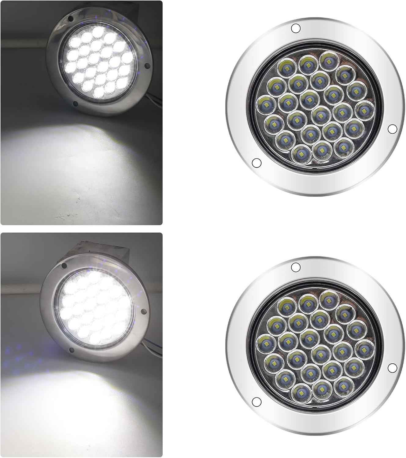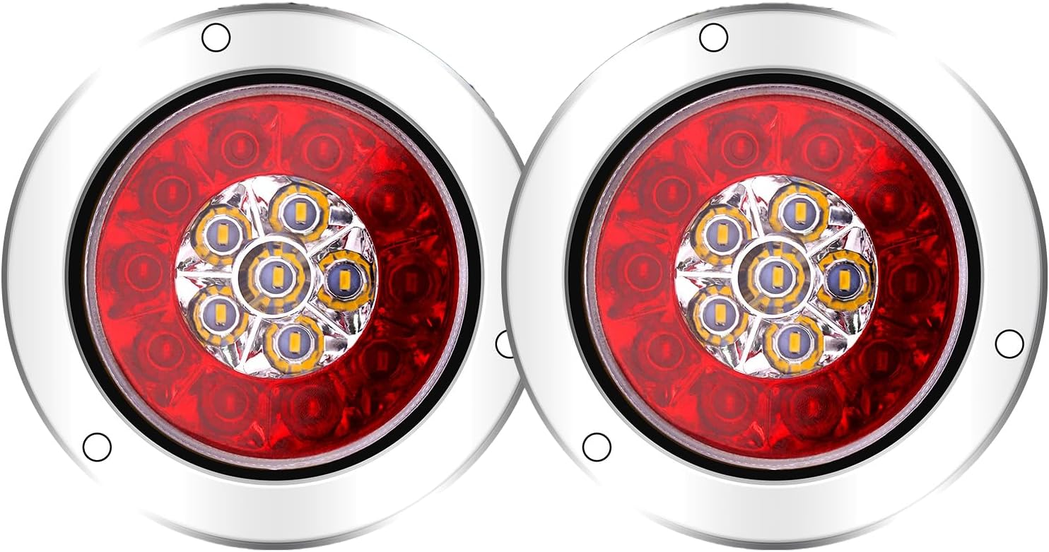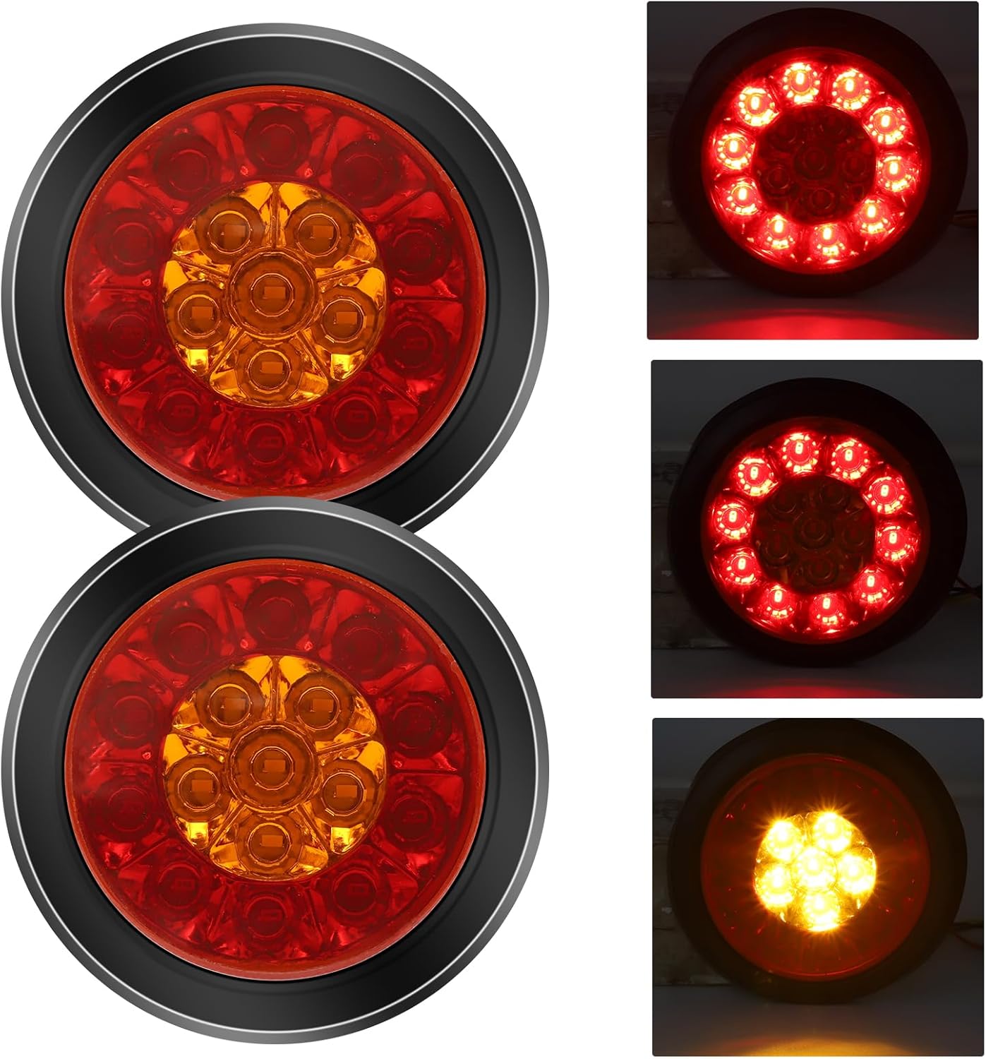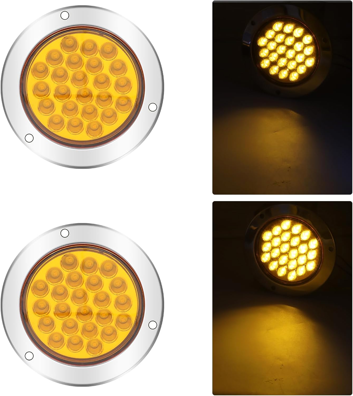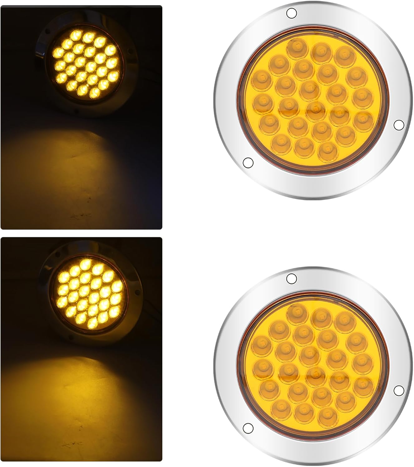 FeatureRound LED Trailer Tail light have LED lights, which are brighter than ordinary 12LED taillights, can have clearer lighting effects and have a good warning effect on nearby vehicles. Package includes 2 pcs Yellow 24LED lights with 4 screw hole Universal fitment for most of Vehicles such as Semi Truck & Trailer, Service Truck, Bus, motorhome, Boats / Marine, Service Van, Utility Truck, Parade Float.