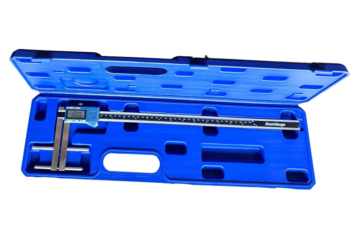 iP54 protective rating: Moisture and dust resistance Range: 4 - 20"/100 - 500 mm Accuracy: ±0.003"/0.07 mmResolution: 0.0005"/0.01 mm/ 1/64" Repeatability: 0.002"/0.05 mm Large LCD display 4" drum preset button 1" & 1.5" depth preset pins Hardened stainless conical contact points On/Off button Hold button Alloy jaws Battery: 3V CR2032 included Supplied in shop protective case