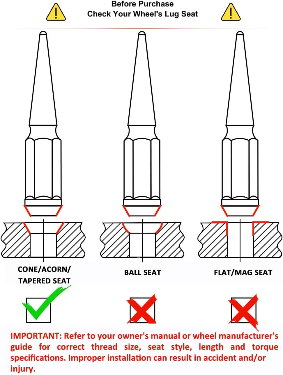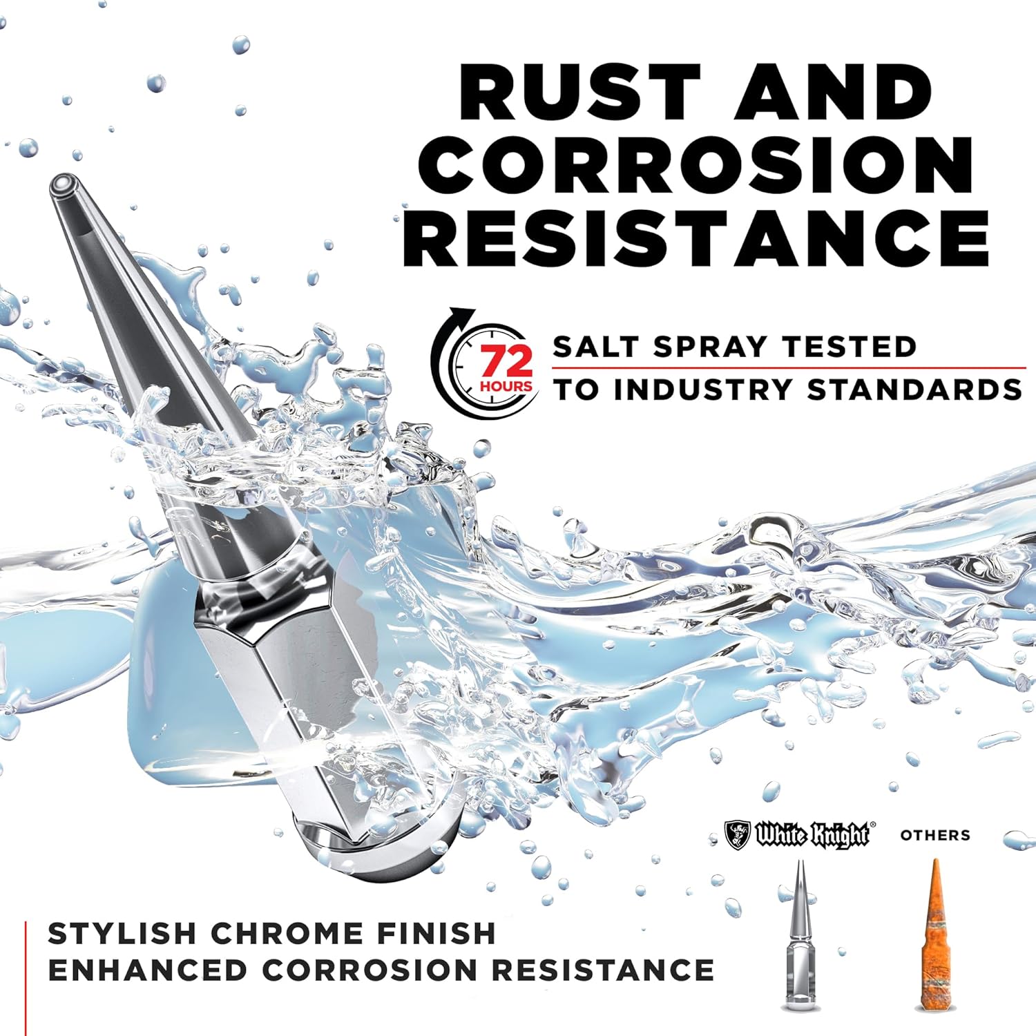FOR AFTERMARKET WHEELS ONLY: White Knight has established a solid reputation of providing the automotive aftermarket industry with quality products at competitive prices. Our specially formulated corrosion protection is applied to meet or exceed the industry's salt spraying standard. We are proud to offer our new 1-piece Long Spike Lug Nuts, available in 25 or 33pc sets.