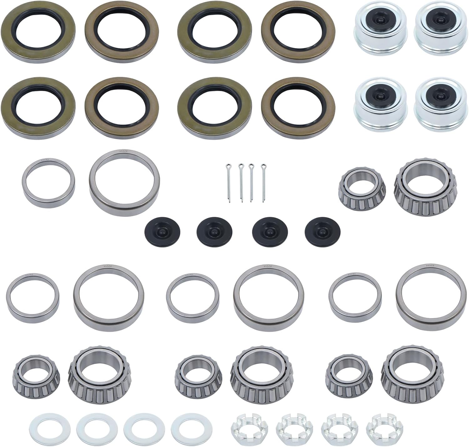Specifications:Inner Bearing Cone 25580 I.D. 1.75''Inner Bearing Race 25520 O.D. 3.265''Outer Bearing Cone 15123 I.D. 1.25''Outer Bearing Race 15245 O.D. 2.441''21333TB/10-10 Grease Seals (2.125" ID x 3.376" OD)22333TB/10-36 Grease Seals (2.250" ID x 3.376" OD)Package includes:4x Inner bearings 255804x Inner races 255204x Outer bearings 151234x Outer races 152454x Grease seals 22333TB4x Grease seals 21333TB4x Cotter pins4x Dust caps4x Rubber plugs4x Spindle nuts4x WashersNOTE:Please check the product model before buying to make sure it is what you need, so that you can get a better shopping experience.