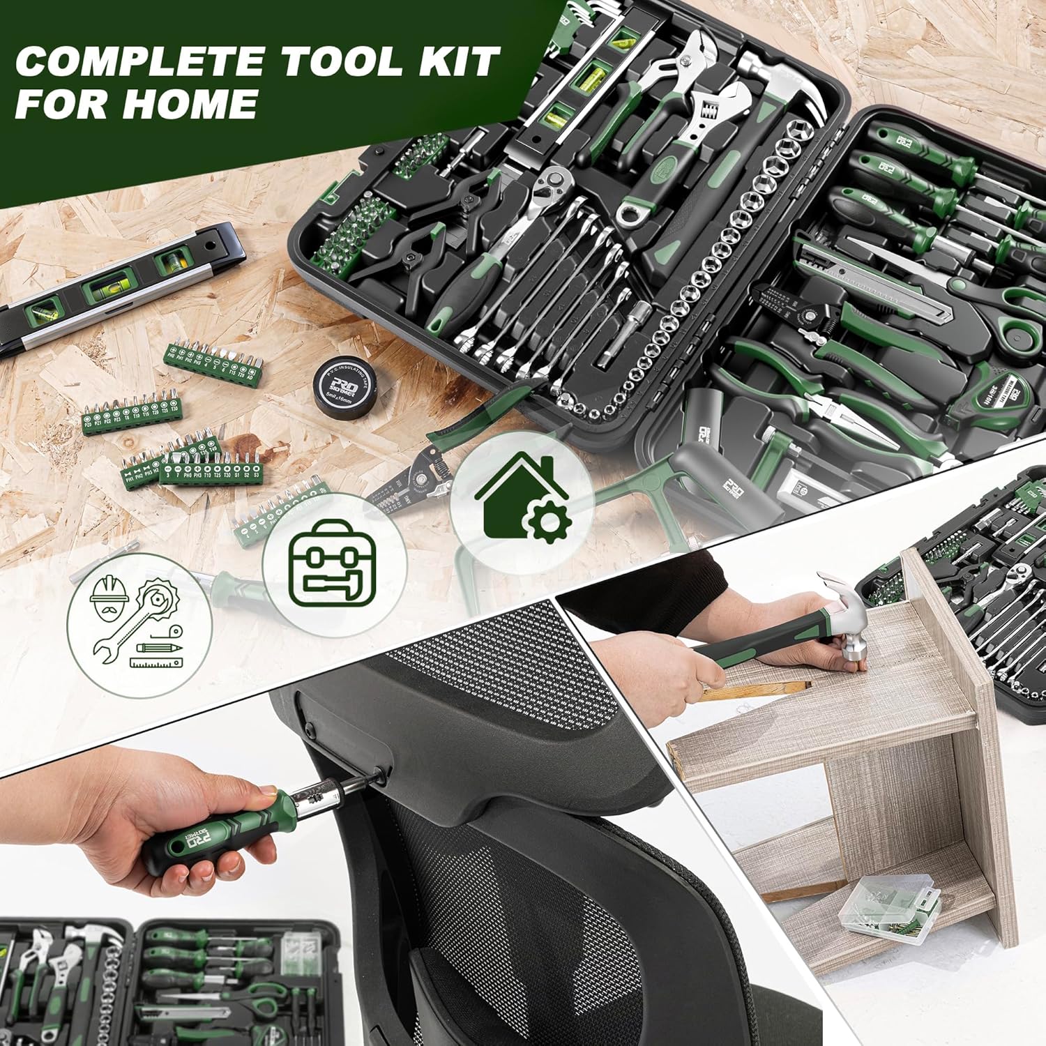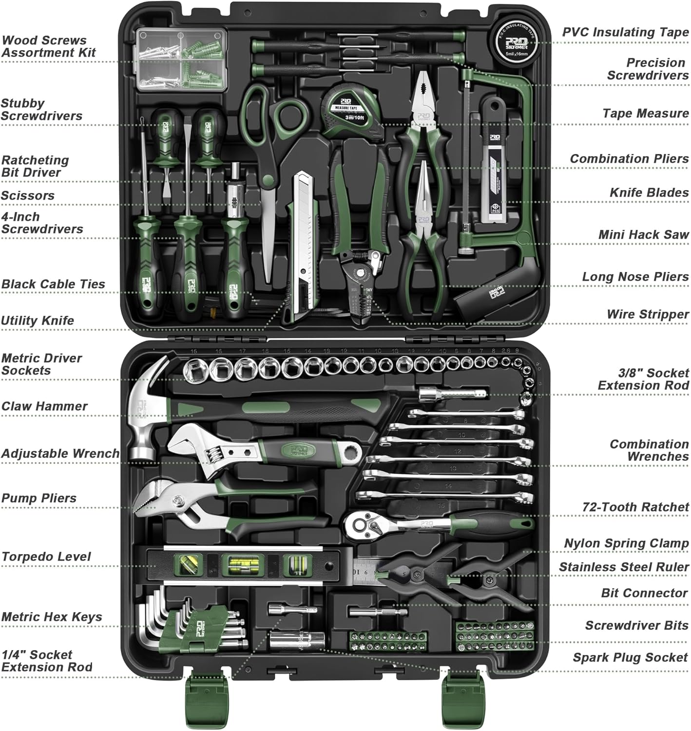 | Included Components | Claw Hammer, Pump Pliers, Magnetic Level , Wire Stripper, Hack Saw, Stainless Steel Ruler, Long Nose Pliers, Combination Pliers, Adjustable Wrench, Utility Knife, Tape measure, PVC Insulating Tape, 72-tooth Ratchet, Wood Screws Assortment Kit, Screwdrivers, Hex Keys, Ratcheting Bit Driver, Driver Sockets, Driver Bits |