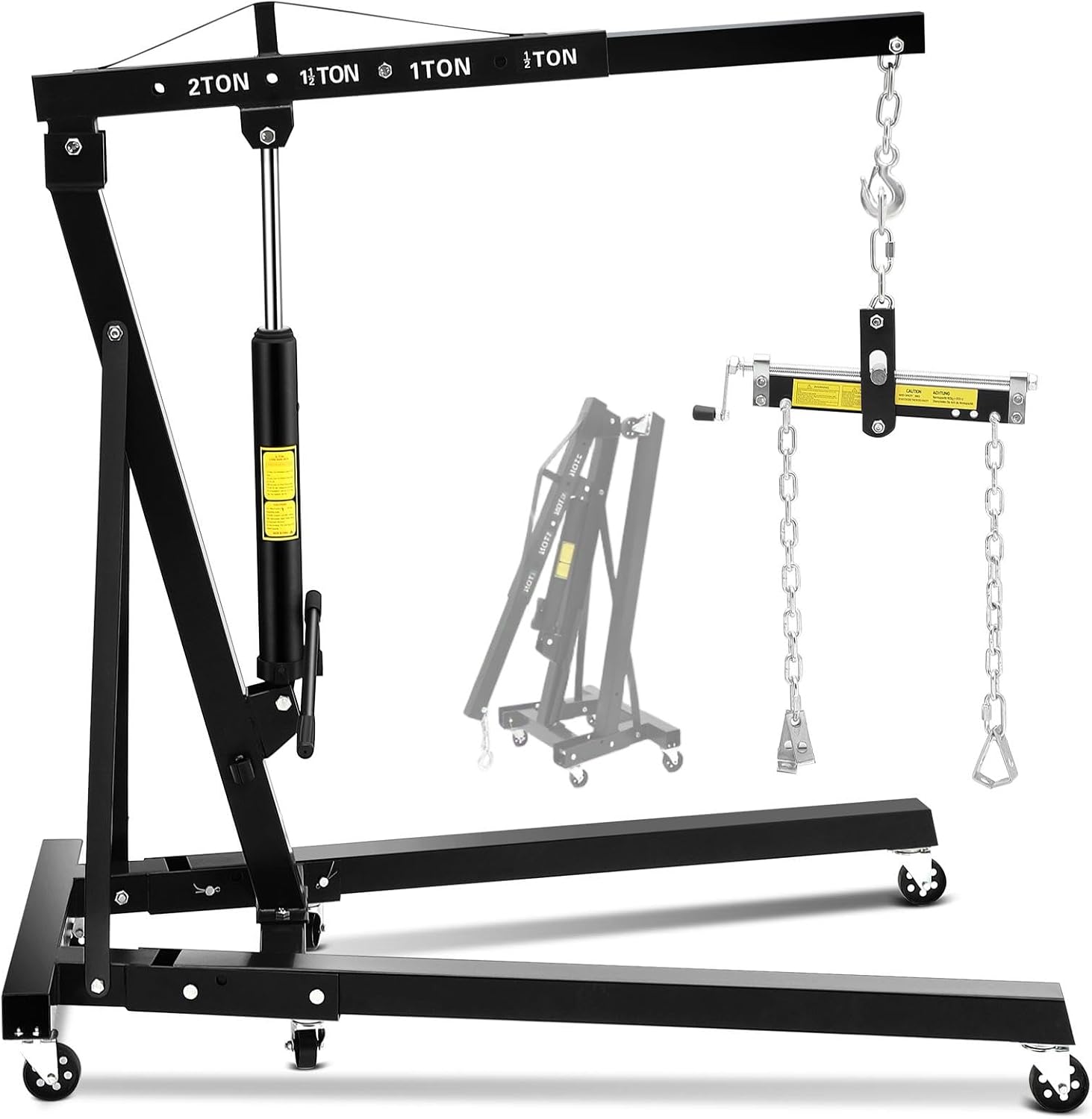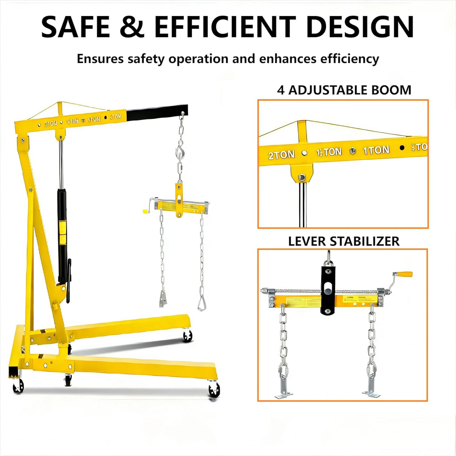 PRODUCT DESCRIPTION: The 2-Ton Foldable Cherry Picker Engine Hoist, now upgraded with an exclusive Lever Stabilizer for enhanced safety and control during critical lifts.-- Engineered for the DIY enthusiast and professional mechanic alike-- Foldable design means it tucks away neatly, saving precious floor space-- 360° swivel wheels provide effortless maneuverability-- Adjustable lifting arms that extend from 38 inches to 57 inches-- With a robust 2-ton capacity, handles engines, transmissions, and other heavy components.PRODUCT SPECIFICATIONS:Lifting Capacity: 2 Ton (4,000 lbs)Height Adjustment Range: 38 inch ~ 57 inch (97 cm ~ 146 cm)Extended Boom Length: 63 inch (160 cm)Material: High-Strength SteelFinish: Anti-Rust Powder CoatingWheels: 360° Swivel CastersSpecial Feature: Included Lever Stabilizer BarWeight: Approximately 187 lbs (85 kg)PACKAGE INCLUDES:1 x Main Foldable Hoist Frame1 x Hydraulic Pump Unit1 x Lifting Arm with Hook1 x Lever Stabilizer Bar6 x 360° Swivel Wheels1 x Manual Handle1 Set of Mounting Hardware & Bolts1 x Instruction Manual