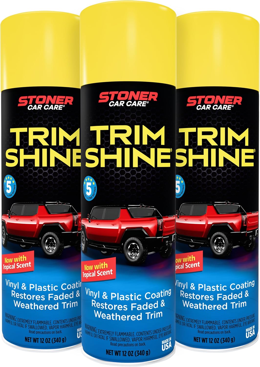Restore the look of faded trim with Stoner Car Care Trim Shine, a professional-grade vinyl and plastic trim restorer designed to refresh and protect interior and exterior automotive surfaces. This fast-drying formula brings back a clean, dark appearance without greasy residue, streaking, or sling, making it ideal for routine maintenance and full detailing alike. Trim Shine revives weathered vinyl and plastic trim to a uniform, OEM-style finish while helping protect against sun exposure and everyday wear. The non-greasy formula dries quickly to a clean, dry touch, keeping trim looking freshly detailed without attracting dust or leaving unwanted buildup on surrounding surfaces. Suitable for both interior and exterior use, Trim Shine is ideal for dashboards, door panels, mirror housings, bumpers, cowl panels, and other vinyl and plastic trim surfaces. Whether used for quick touch-ups or regular vehicle care, it delivers consistent results with minimal effort. Available in both aerosol and spray formats to match your preferred application method, Trim Shine provides reliable performance trusted by automotive professionals and car care enthusiasts alike. Proudly made in the USA, it reflects Stoner Car Care’s commitment to quality, performance, and dependability.